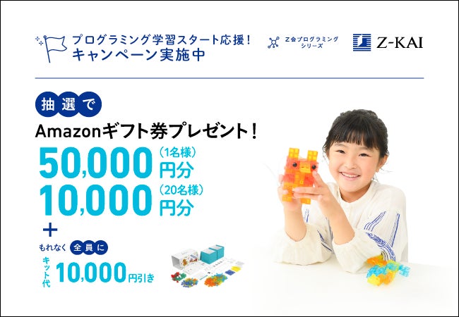 小学生向けプログラミング通信教育「Z会プログラミング講座 みらい with ソニー・グローバルエデュケーション」または「Z会プログラミング講座 with LEGO(R) Education」をお申し込みの方で、同時にキットご購入の方を対象に、抽選で1名の方に50,000円分、20名の方に10,000円分のAmazonギフト券をプレゼントするキャンペーンを実施中です。現在、キット代もZ会特別価格よりさらに10,000円引きとなっており、大変おトクに始めていただけるチャンスです!