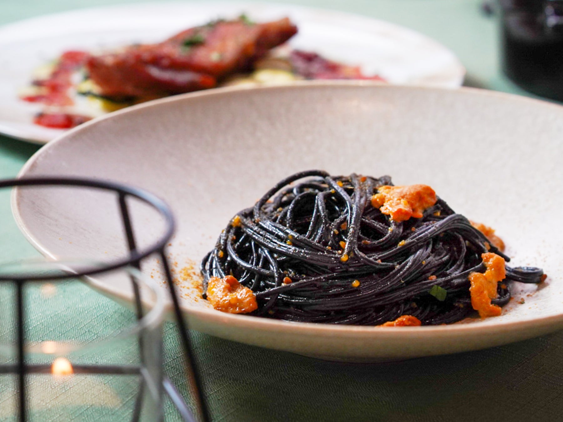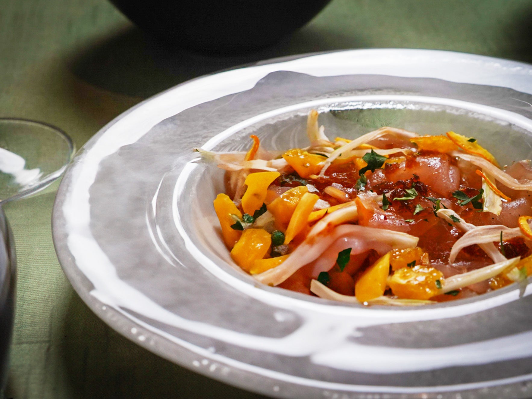 ランチメニューに加え、ディナータイムには、より風味豊かで贅沢な“大人の味わい”をテーマとした特別メニューをご用意しております。「カジキの燻製 奈良漬けとオレンジのソース」や漆黒のイカ墨パスタと絡めた「ウニとズッキーニのイカ墨パスタ」は、ひと口ごとに広がる海の旨みと、クリーミーな食感が魅力の逸品です。また、豊かな自然と伝統の技で育まれた大和肉鶏を使用した「大和肉鶏のカチャトーラ風」では、柔らかく上質な肉質を最大限に活かし、シェフ特製のソースとともに炭火で丁寧に焼き上げてご提供いたします。さらに、「葛城市産・桑の葉のガトーフロマージュ メロンとディル」は、瑞々しいメロンの甘みと香り高いディルが溶け合い、極上の余韻をお楽しみいただけます。特別な一日の締めくくりにふさわしい、心に残るディナータイムをぜひご堪能ください。