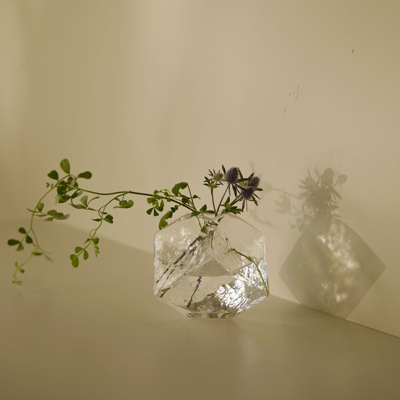 1932年創業より手仕事によるガラス製造にこだわり、使い手の暮らしを彩り、寄りそうものづくりを行う「菅原工芸硝子株式会社」が手掛ける花器。ガラスならではの輝きや色彩、暮らしのシーンを演出するデザインが魅力的です。キューブベースはどんなお花にも合わせやすく、置く角度を変えてみたり、重ねてみたり、その日の気分でガラスならではの輝きや色彩を楽しめます。