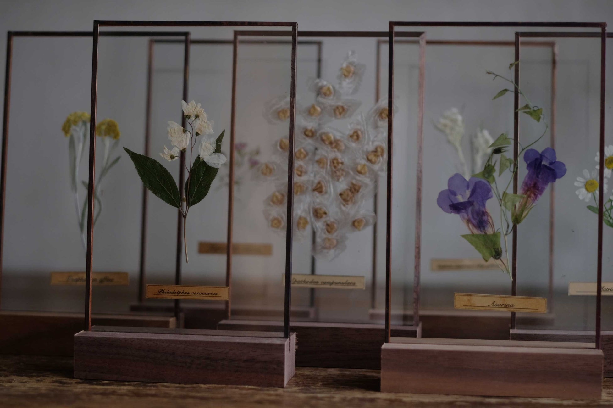 「古」と「生」、対(つい)の要素が共存するショップ「はいいろオオカミ+花屋 西別府商店」が、「いつか、どこかで、だれかが作った植物の標本...」をコンセプトに製作した自然物の一瞬をガラスで綴じたガラス標本。