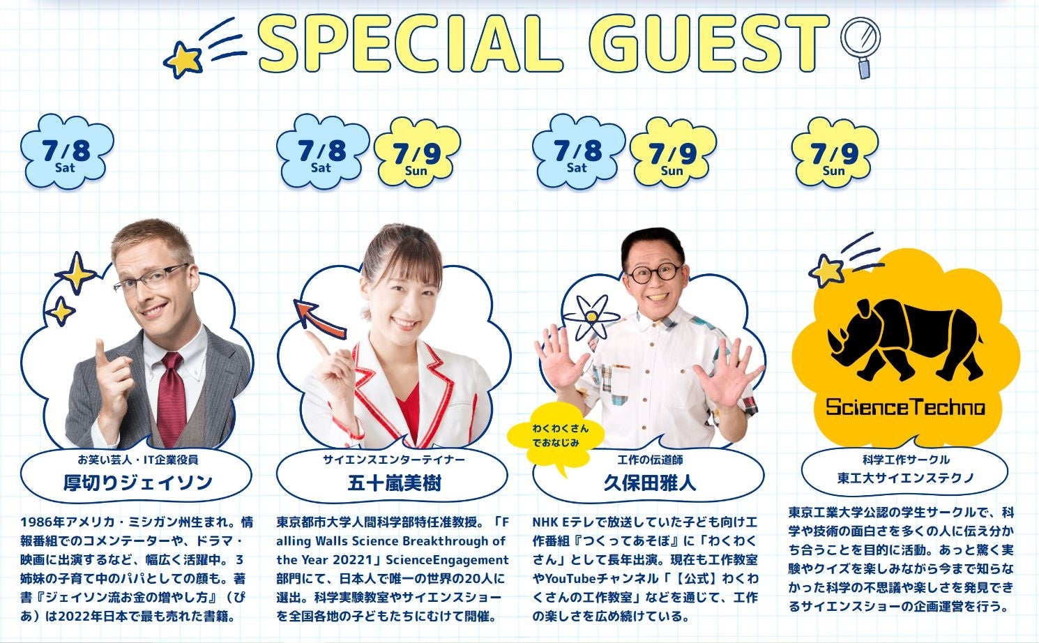 子どもたちの探究心を刺激するステージショーやワークショップ、自由研究のヒントになる展示など、親子で楽しめるプログラムが盛りだくさん!