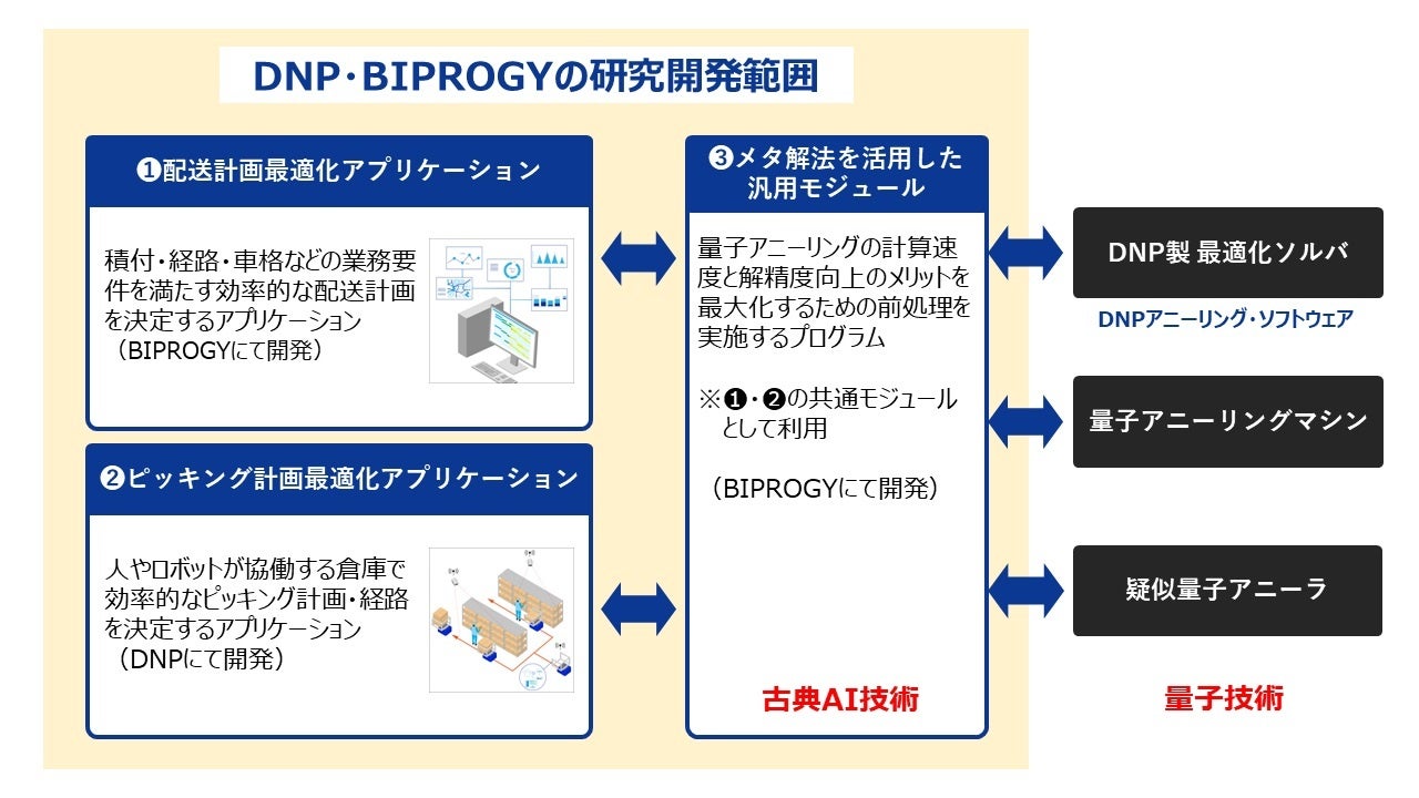 両社は、今回採択された研究開発テーマで、量子インスパイアード技術*2を含む量子アニーリング*3と、古典AI技術*4を組み合わせた「量子・AIハイブリッド技術」を活用した最適化アプリケーションを開発します。物流・交通分野における配送計画の最適化や、倉庫内のピッキング計画の最適化などの課題に適用します。開発するアプリケーションは、DNPグループ内の製造・物流現場やBIPROGYの顧客企業にて導入実証を行い、本格的なサービスの導入につなげていく予定です。また、当アプリケーションの普及や導入支援につながるさまざまな取り組みを推進していきます。
