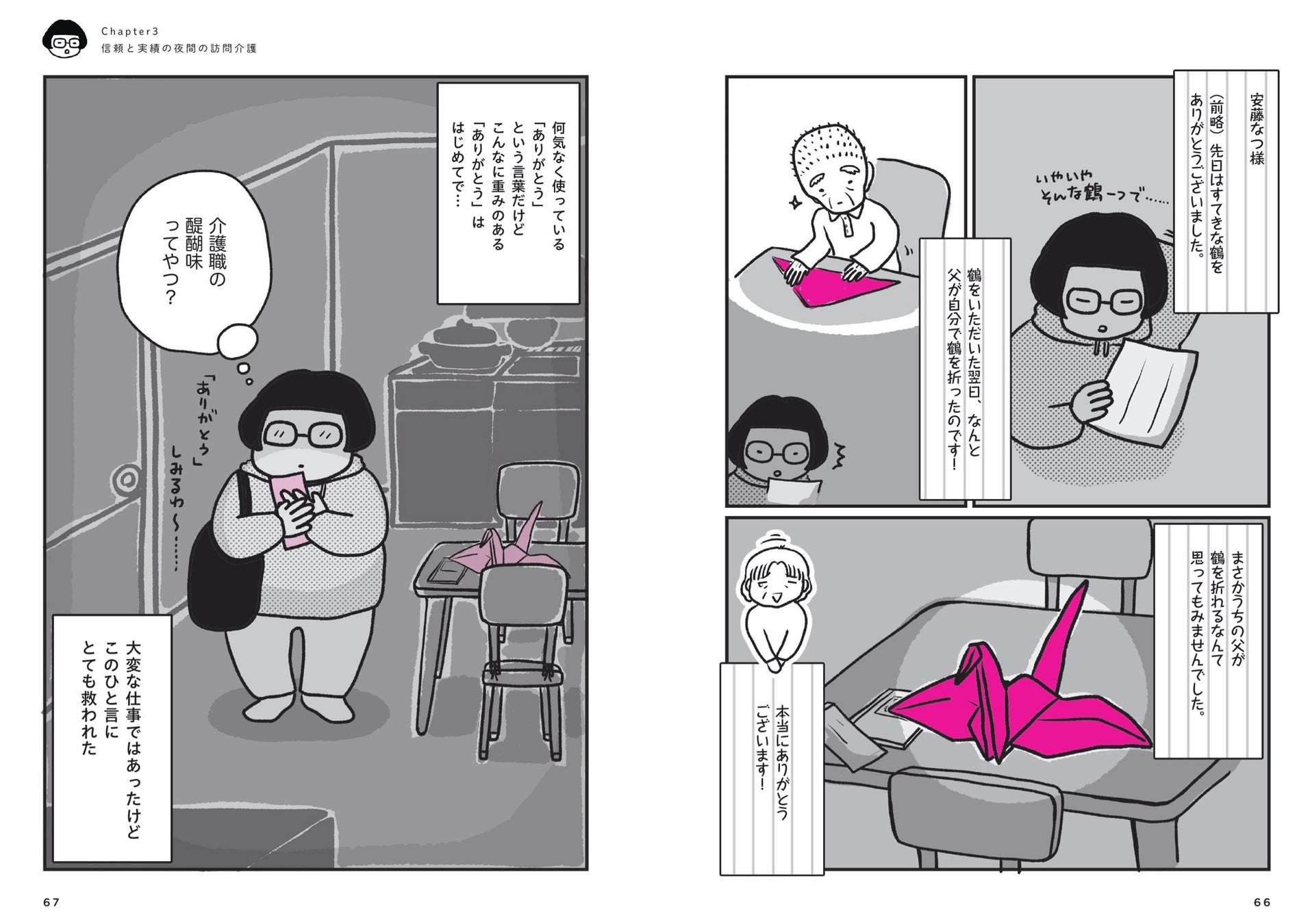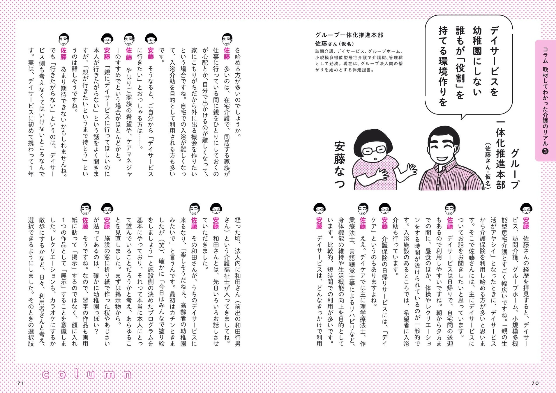 コミックエッセイに加えてコラムも充実、介護福祉士や特養の施設長など介護職に関わる方々と安藤なつさんとの対談コラムから、介護のリアルを知ることができます。