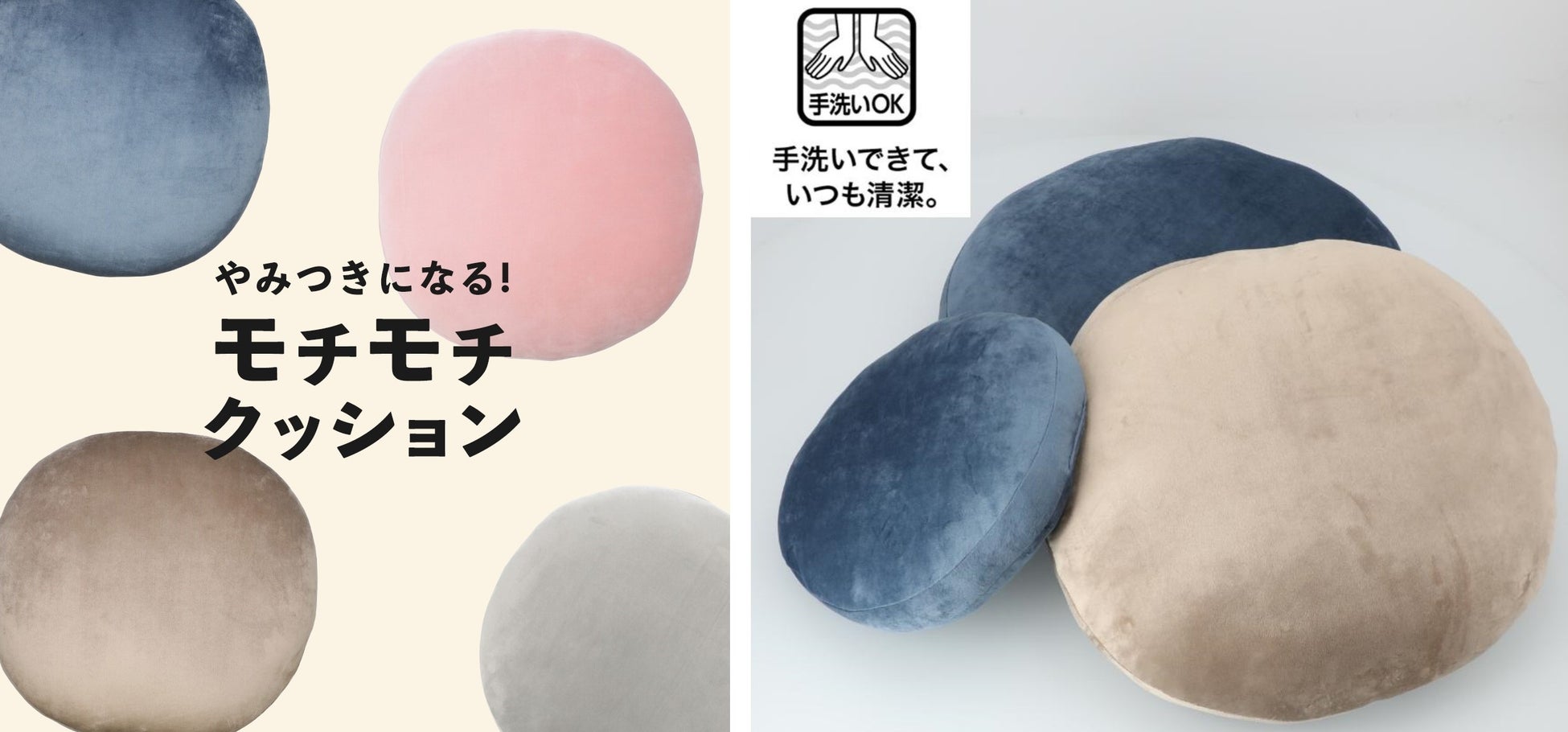 やみつきになるモチモチ触感!ニトリのモチモチクッション(2サイズ・4色)が手洗い可能へと進化! もっと清潔・快適にご使用いただけるようになりました。