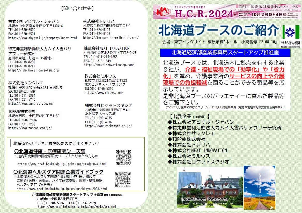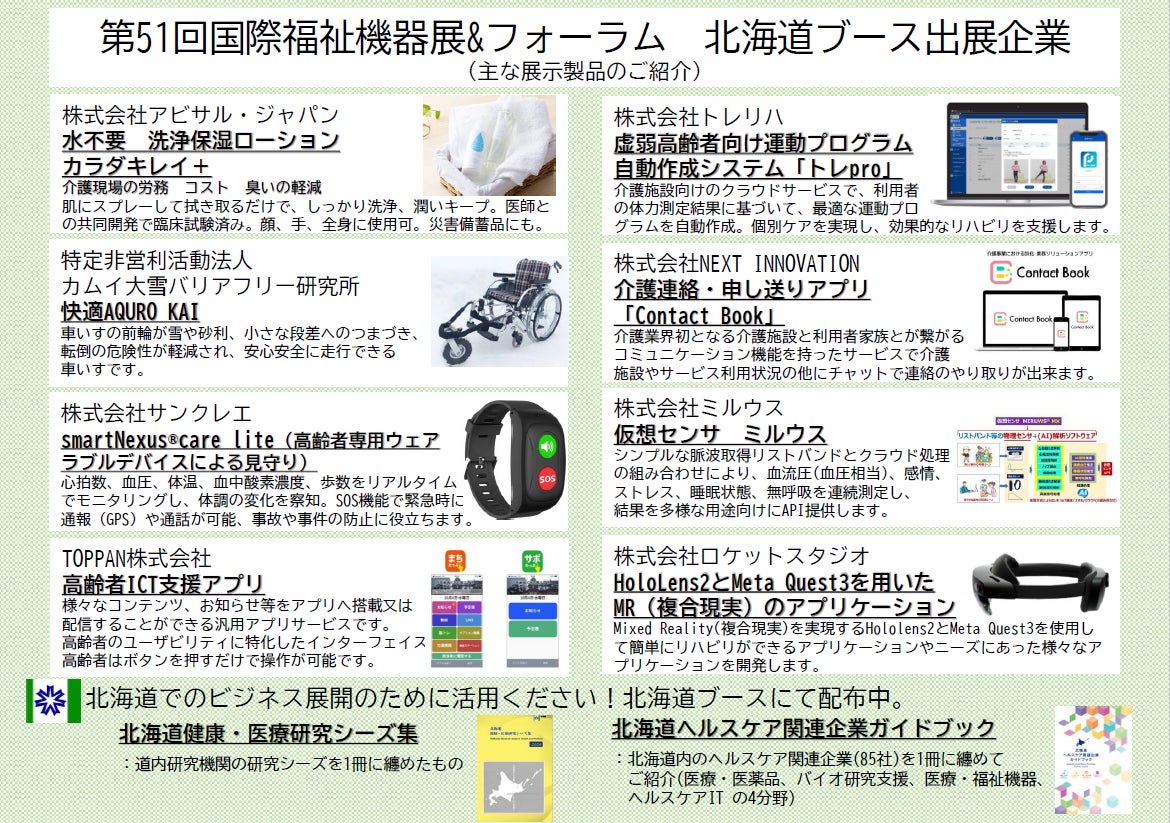道では、高齢化社会の進行を背景に成長が見込まれるヘルスケア関連産業において、介護・福祉分野に関連する製品のPRや取引拡大を図るため、東京都で開催される展示会に、道内企業8社による北海道ブースを出展しますのでお知らせします。