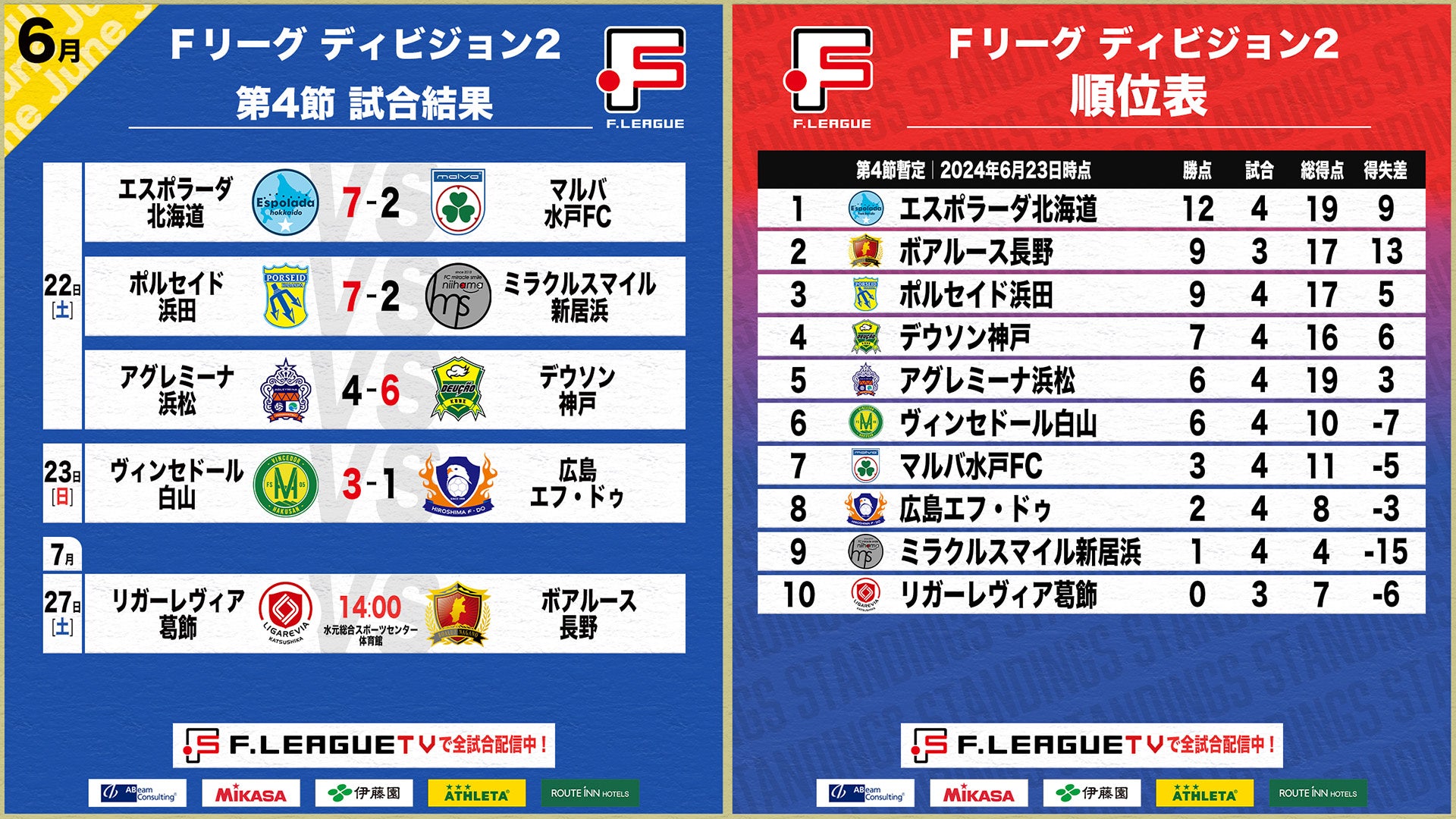 6月22日(土)・23日(日)の2日間で実施されたFリーグ2024-2025 ディビジョン2 第4節の4試合について結果をお知らせいたします。
