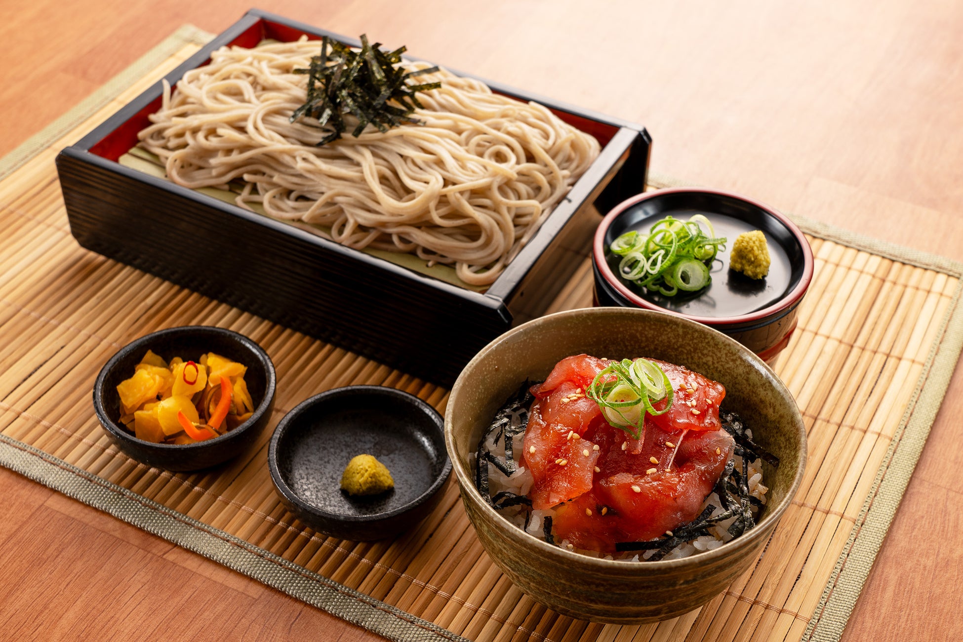 のど越しの良いつるっとした食感を楽しめるざるそばと特製の醤油ダレに漬け込んだマグロ丼のセットです。