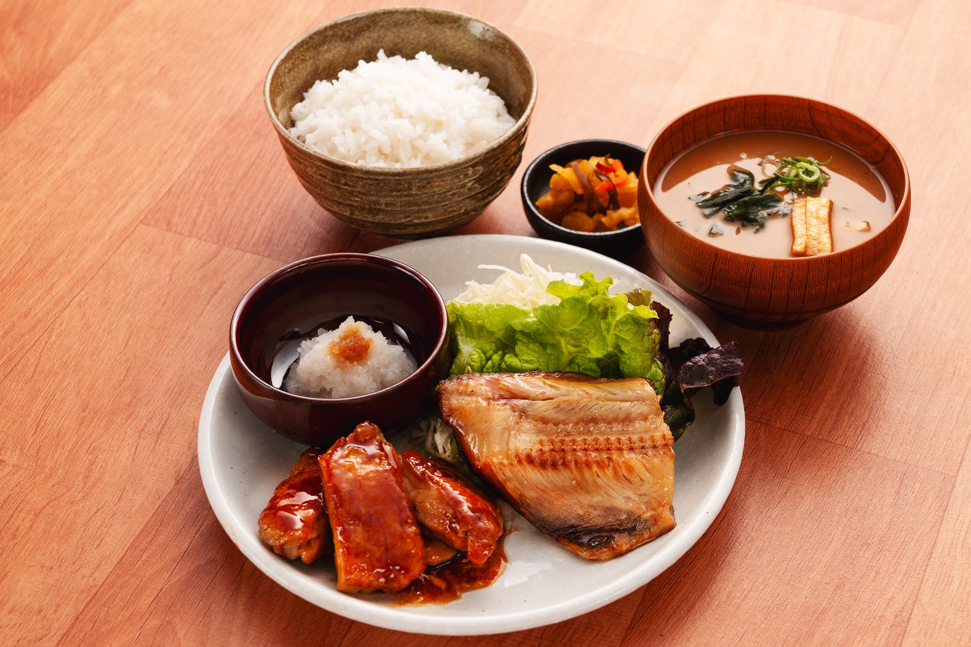 アッサリとしたしまほっけとコッテリとした甘辛ソースで仕上げたチキンステーキが合い盛りになった欲張り定食です。