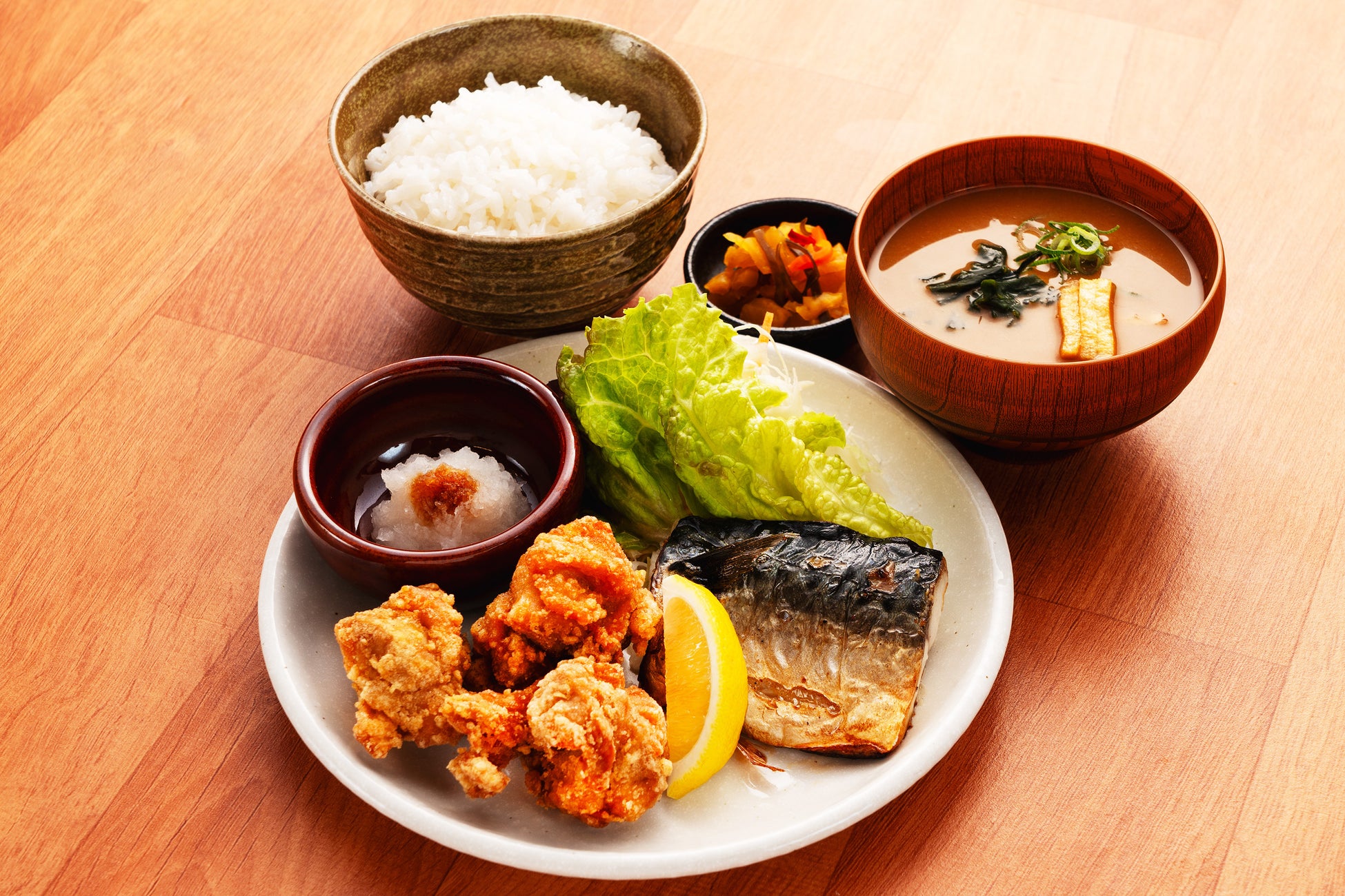 脂の乗った塩サバと、鶏の唐揚げを合わせたご飯がすすむ欲張り定食です。