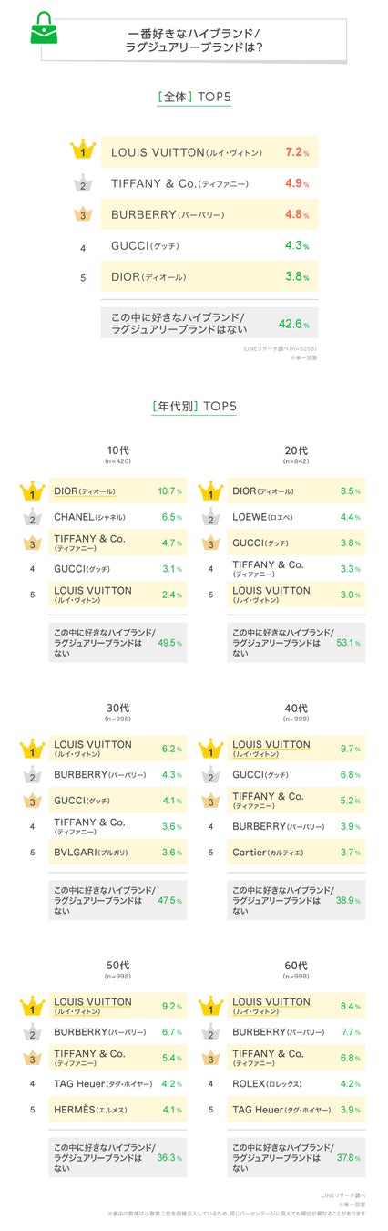【LINEリサーチ】一番好きなハイブランドの全体1位は「LOUIS VUITTON」!10~20代では「DIOR」が1位