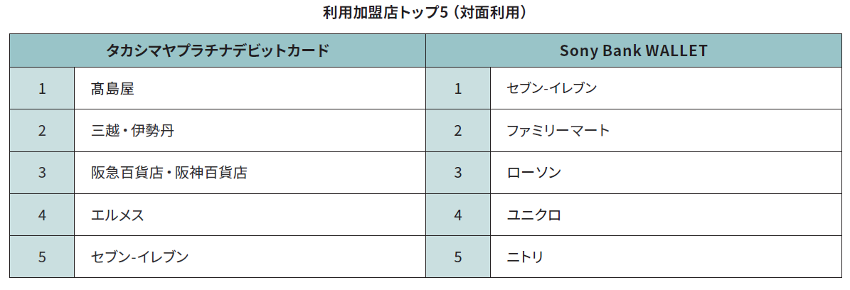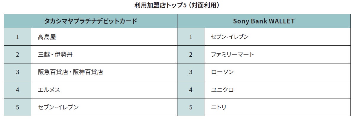 対面利用加盟店における年間利用金額のトップ5は最上位が髙島屋、その他百貨店、ブランドショップなどの高級品を扱う加盟店がランクイン。コンビニエンスストアや衣料品・家具など、日常利用先が中心となる Sony Bank WALLET とはご利用店舗でも違いが顕著に。
