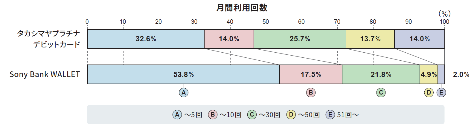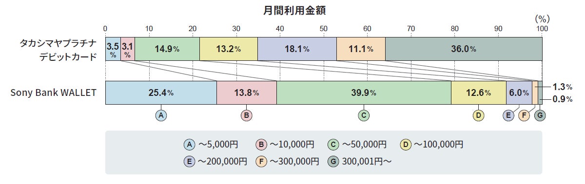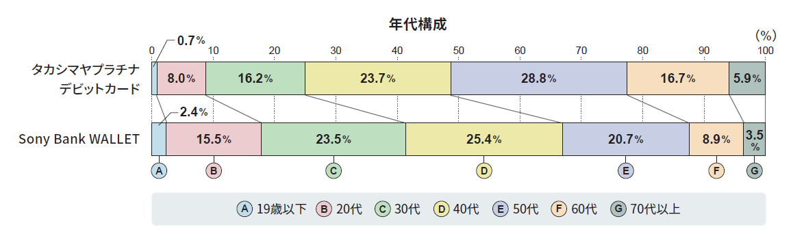 また、タカシマヤプラチナデビットカードは50代以上が51.3%と半数以上となり、30代~40代のかたが中心となる Sony Bank WALLET と比較すると年齢構成に特徴が見られました。