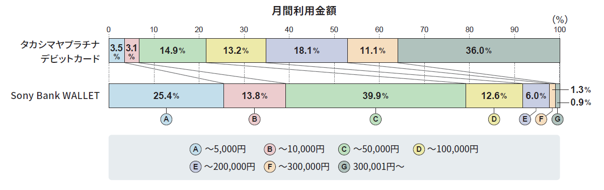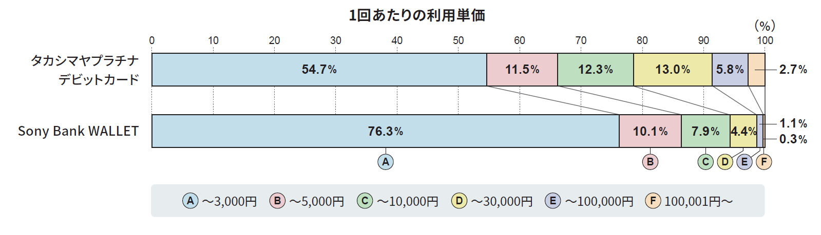 利用単価は3,000円以下が半数以上の54.7%と Sony Bank WALLET 同様に日常使いに多く利用されています。一方で100,000円以上の利用単価が Sony Bank WALLET と比較し9倍の差があり、高価な買い物にも積極的に利用されていることがわかります。