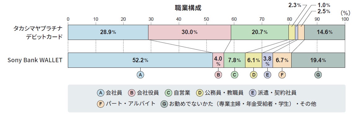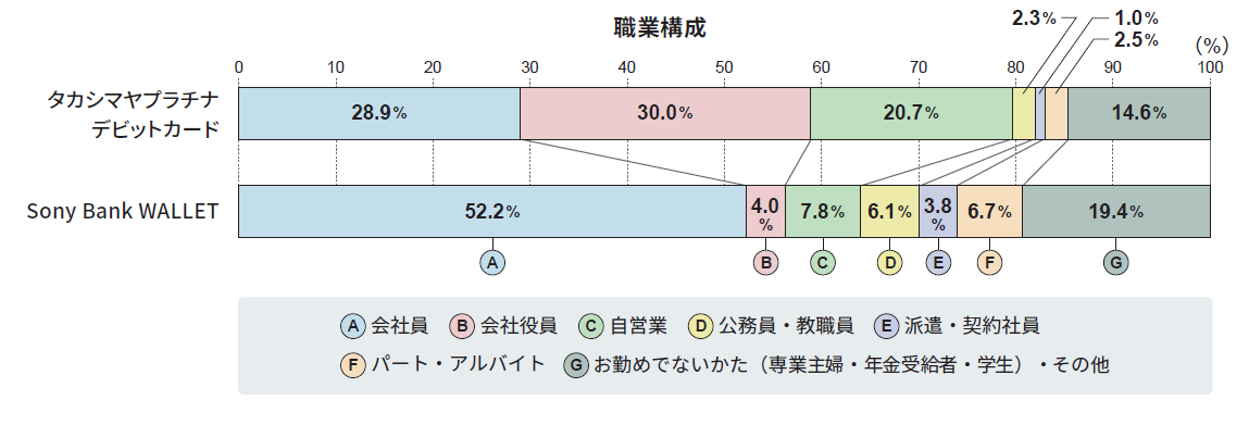 ・ タカシマヤプラチナデビットカード会員の職業は会社役員および自営業で51%と半数以上を占める。Sony Bank WALLET(タカシマヤプラチナデビットカード除く。以下同様)会員の職業構成と比較すると、会社役員は7.5倍、自営業は2.7倍。