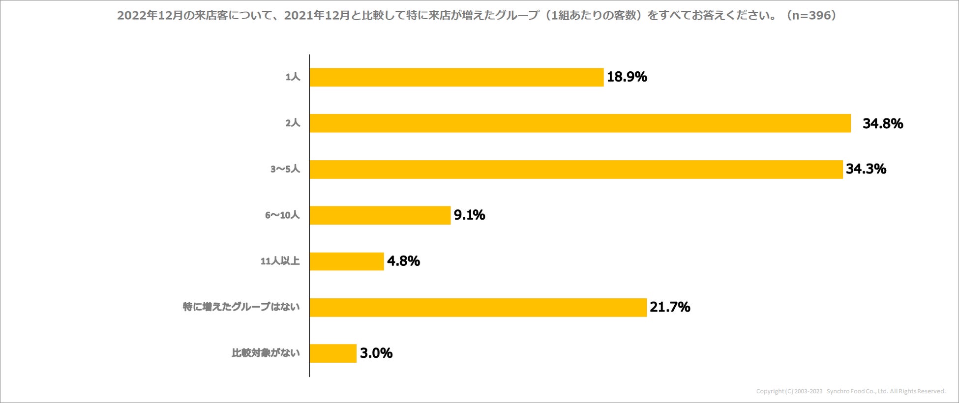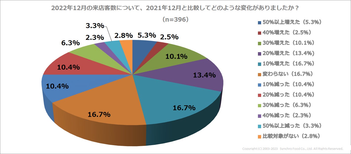 まず、2022年12月の来店客数について、2021年12月と比較してもらったところ、「2021年12月より10%増えた(16.7%)」と「2021年12月と変わらない(16.7%)」との回答が、最多となりました。全体を見ると、「2021年12月より増えた」との回答が48%見られる一方、32.7%は「2021年12月より減った」と回答しており、集客に苦労している店舗も少なくない印象です。