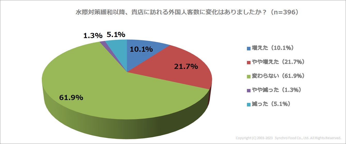 新型コロナウイルス感染症に関する水際対策が、2022年10月11日、大幅に緩和されました。そこで、水際対策緩和以降、店舗に訪れた外国人客数が変化したか尋ねると、61.9%が「変わらない」と回答する結果となりました。対して、「概ね増えた」(増えた=10.1%、やや増えた=21.7%)との回答も31.8%見られることから、水際対策緩和により、わずかながら飲食店のインバウンド需要が回復している様子がうかがえます。