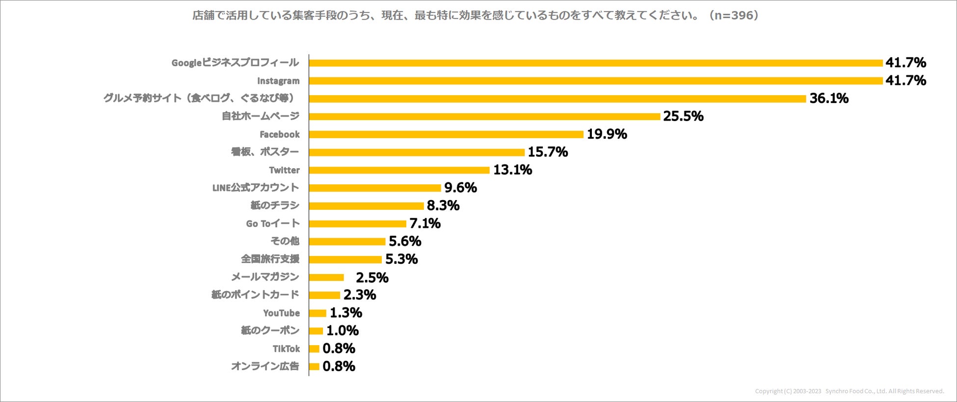 続いて、店舗で活用している集客手段のうち、現在、最も効果を感じているものをすべて答えてもらったところ、「Googleビジネスプロフィール」と「Instagram」がともに41.7%で、同率最多となりました。次いで、「グルメ予約サイト(36.1%)」、「自社ホームページ(25.5%)」、「Facebook(19.9%)」と続き、上位はいずれもインターネットやSNSによる集客手段が占めています。