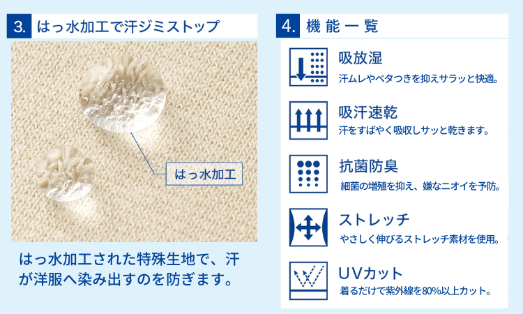 前側と後側の脇についた大きな汗取りパッドで、汗を逃がさずキャッチ。特殊な2重構造の汗取りパッドは、肌側は汗やムレをしっかりキャッチして湿気を逃がし、外側では、はっ水加工で洋服に汗が染みだすのを防ぎます。
