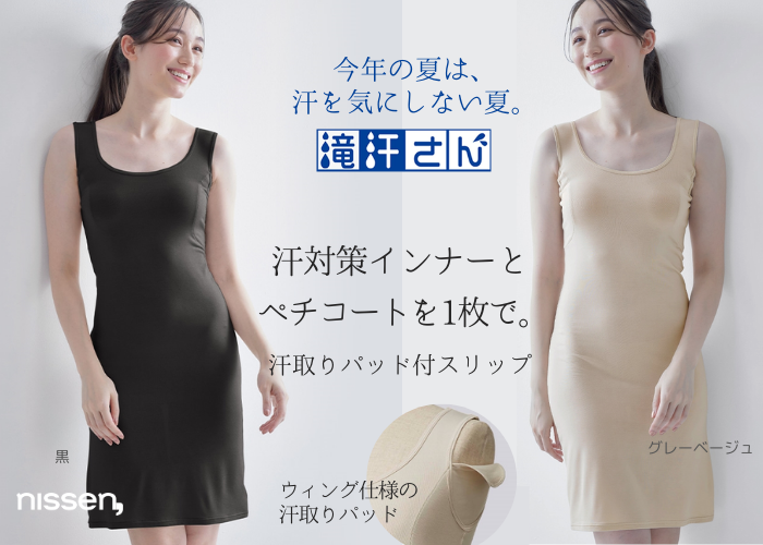 その悩み、「滝汗さん」におまかせください。まるで、汗取り付きのインナーとペチコートを1枚にしたような「スリップ」タイプが、2024年の夏に新登場しました。