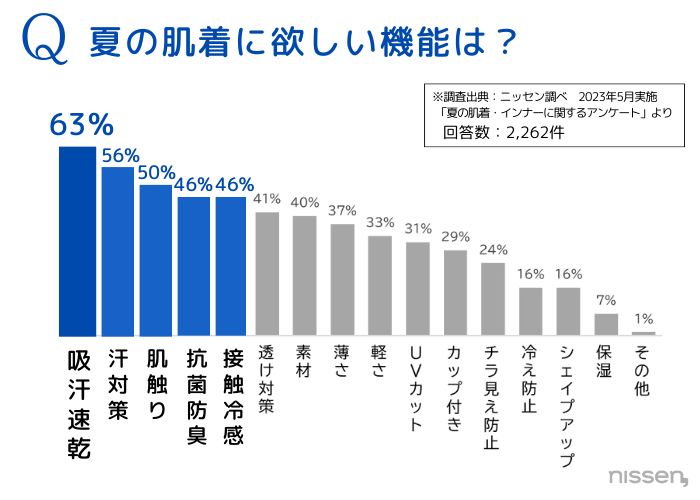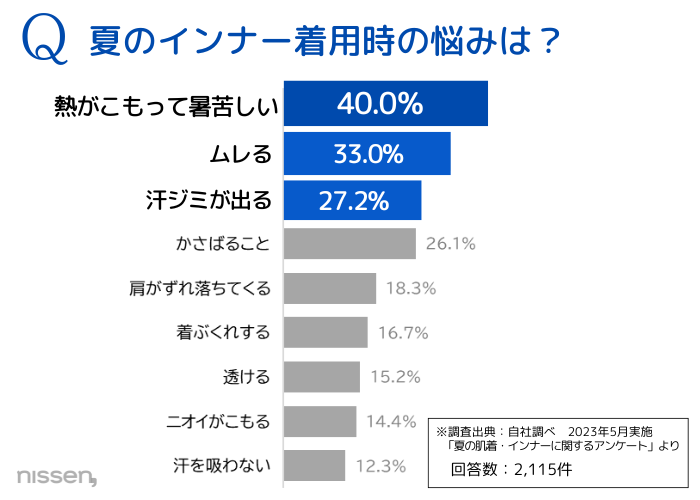 夏場の肌着着用率は、約8割。そして、夏の肌着に求めるのは”汗対策”と”ムレ”。