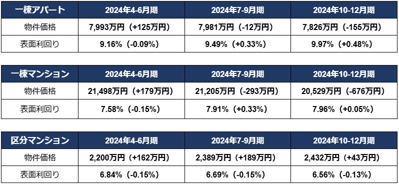 一棟アパート、一棟マンションの価格は前四半期と比較して下落したものの、引き続き高値で推移しており、価格高騰の傾向は変わらない結果となりました。区分マンションにおいては2023年7月~9月期から6四半期連続で過去最高値を記録しており、2012年の集計開始以降初めて2400万円台に乗りました。