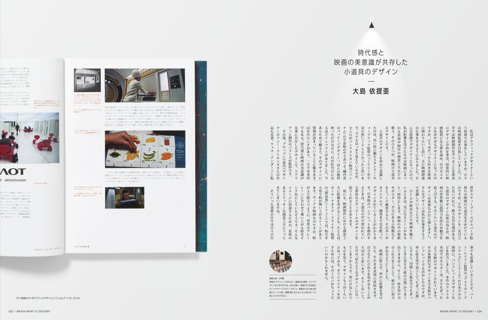 映画関連のデザインの仕事を多数手がける大島さん。映画にまつわる表現や制作物に影響を受けており、その最たるものが小道具のデザイン。映画『2001年宇宙の旅』(スタンリー・キューブリック監督)で宇宙船の中に登場する「機内食」のパッケージなど、その創意工夫の数々から学んだこととは。