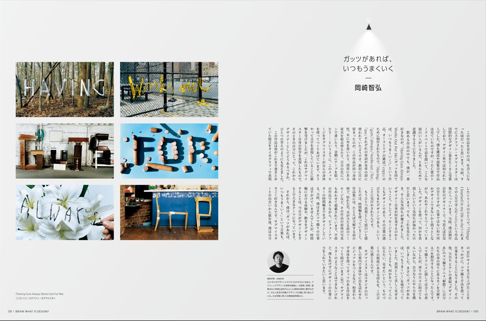 アメリカのグラフィックデザイナー、ステファン・サグマイスター。岡崎さんがその作品の中で最も好きだというのが「HavingGuts Always Works Out For Me(ガッツがあれば、いつもうまくいく)」。木に布を巻いたり、部屋にある家具を組み替えたりと、身体を使って表現している点はもちろんのこと、サグマイスター自身の「哲学」が表現されている点に強く惹かれたといいます。