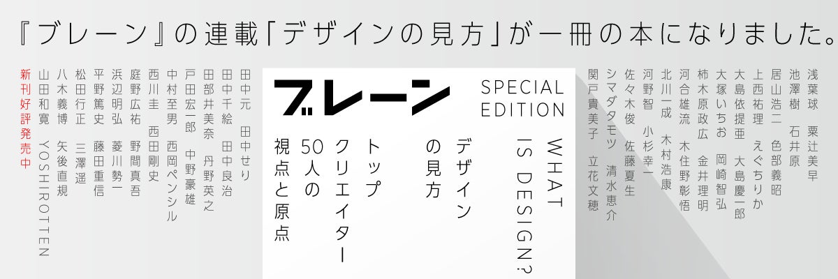 では、ここで言う「デザインの視点」とは一体何でしょうか。そもそも「デザイン」とは何なのでしょうか。月刊『ブレーン』では、2009年から「デザインの見方」という連載を通じて、トップクリエイターたちとともに「デザインとは何か」という問いに対する答えを追い求めてきました。総勢170人以上が答えにたどり着くまでの視点や着眼点、ブレイクスルーとなった原体験の数々には、そのヒントが隠されています。