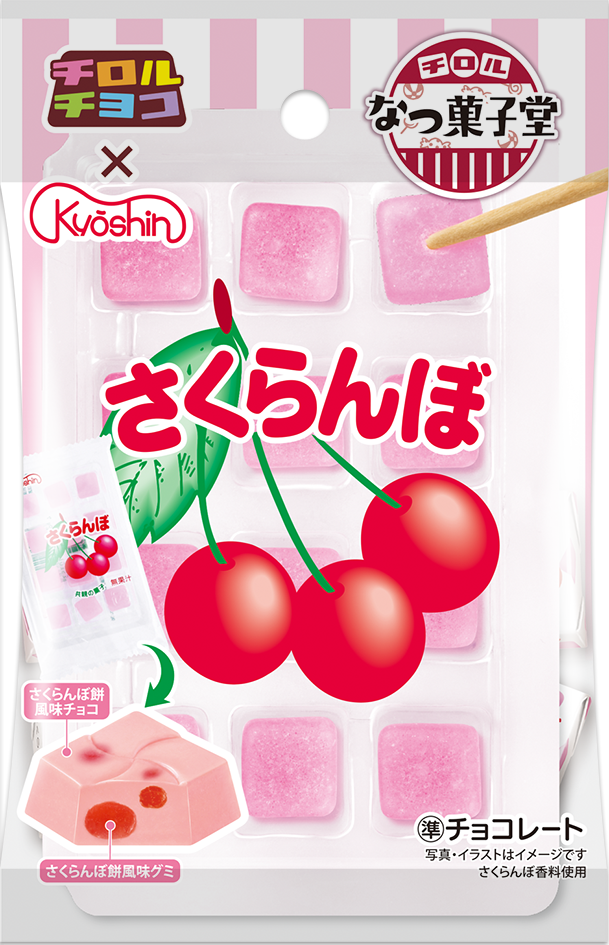 さくらんぼ風味チョコの中にさくらんぼ餅をイメージしたつぶグミを閉じ込めました。やさしい香りともちもち食感が楽しめます。