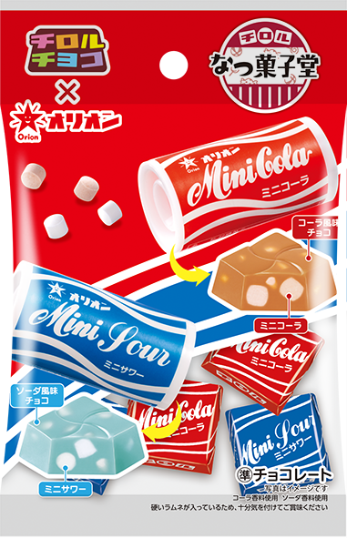 ミニコーラ、ミニサワーのラムネをそのままチロルチョコに入れました。甘くて爽やかなチョコと、食べ応えのあるラムネの組み合わせが特徴です。