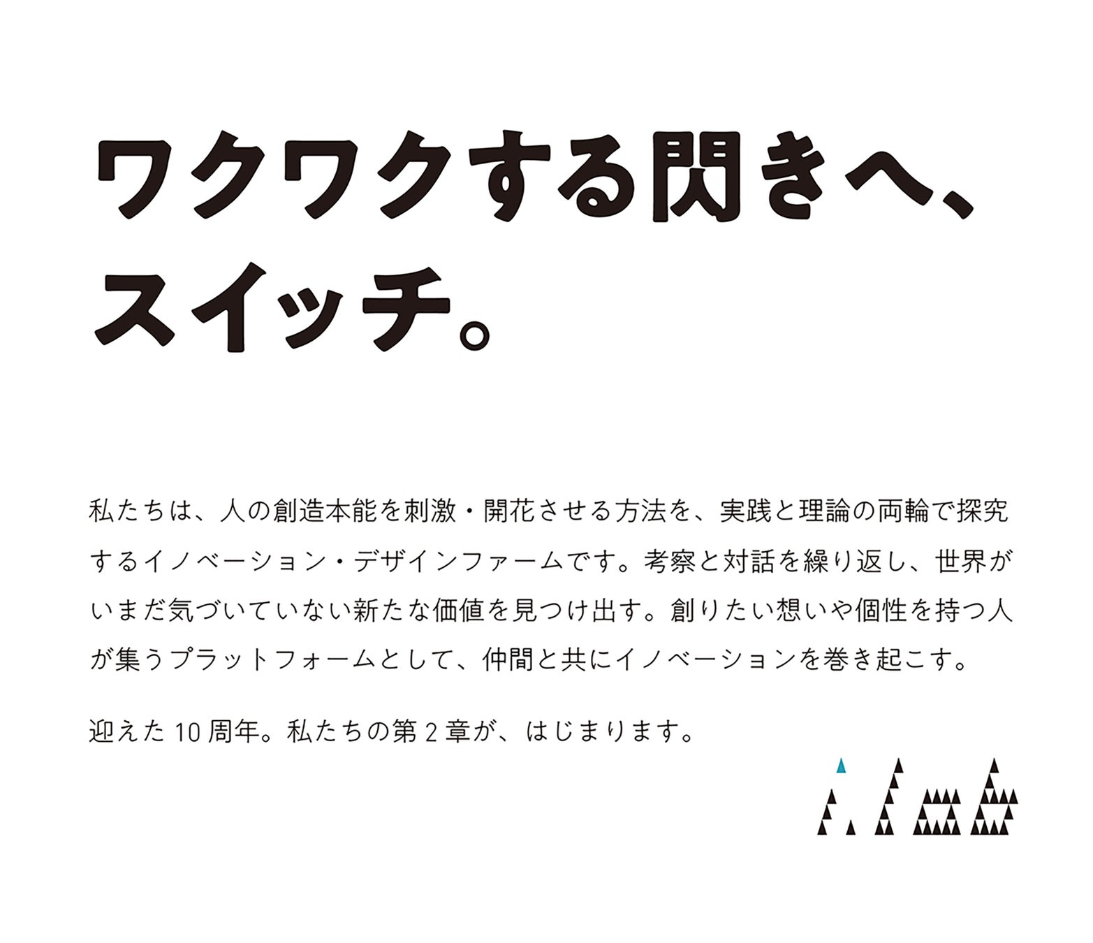 「ワクワク」を、これからの私たちの最も大事な判断軸と定めます。「ワクワク」は、0から1を生み出す原動力であると同時に、多くの人を惹きつける力。そしてi.labの強みは、これまでの10年で創り上げた、閃きを生み出せる独自メソッド。「ワクワク」と「閃き」を組み合わせることで、既定路線ではない創造的な未来へと自社と顧客、社会をスイッチさせていきます。