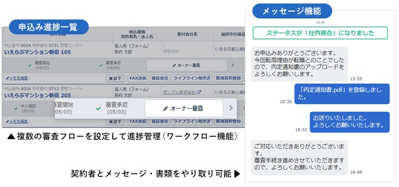 この連携により、家賃保証の審査申込みがオンラインで可能となり、申込情報の連携(内容変更やキャンセルなどの更新情報含む)や審査結果の登録がワンクリックで簡単に行えるようになります。また、審査結果も画面上で確認を行うことができ、業務の効率化につながります。
