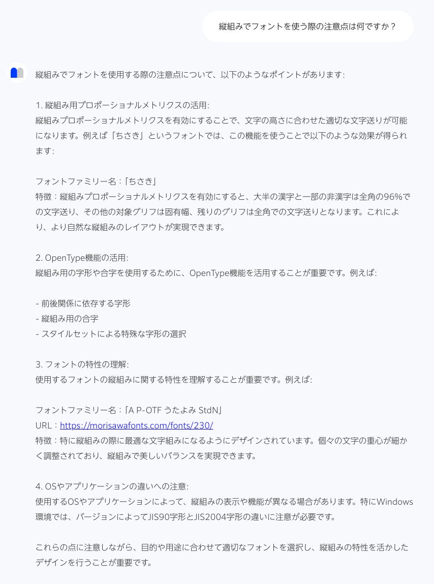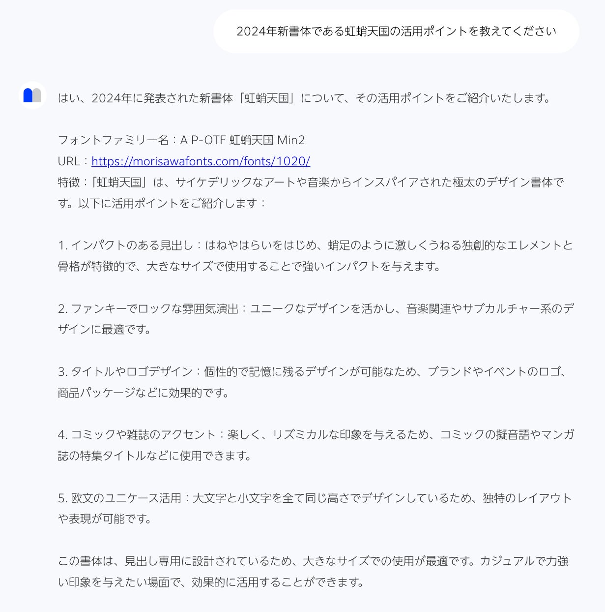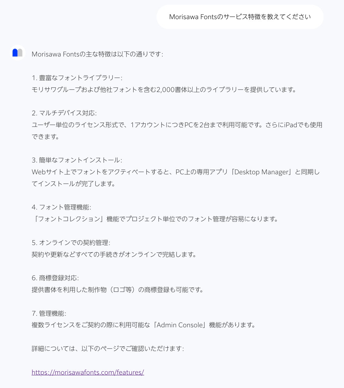 Morisawa Fontsに関するさまざまな疑問に答えてくれる機能です。書体に関する情報に加えて、ライセンス情報や組版の知識などをユーザーの皆様に分かりやすく解説します。個別書体の具体的な活用方法なども提案できるため、書体利用の幅を広げることにも役立ちます。また、 製品のサービスメリットなどを端的にお答えすることもできるため、Morisawa Fontsの利用を検討しているお客様の検討の手間や時間を省くことも可能になります。