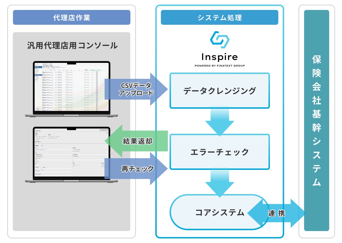 次世代金融インフラの提供を通して組込型金融を実現するFinatextグループの株式会社Finatext(本社:東京都千代田区、代表取締役CEO:木下 あかね、以下「Finatext」)は、SaaS型デジタル保険システム「Inspire(インスパイア」に、「契約情報一括取り込み&エラーチェック機能」を追加しました。本機能はSBI損害保険株式会社(本社:東京都港区、代表取締役社長:小野 尚、以下「SBI損保」)の動産総合保険団体契約に導入され、2025年10月1日より契約団体が「Inspire」の業務コンソール上で利用を開始しています。従来Excelファイルや紙で行われていた加入者(被保険者)情報の通知業務をデジタル化することにより、SBI損保および契約団体の月次業務対応時の業務負荷を大幅に軽減できるものと見込んでいます。