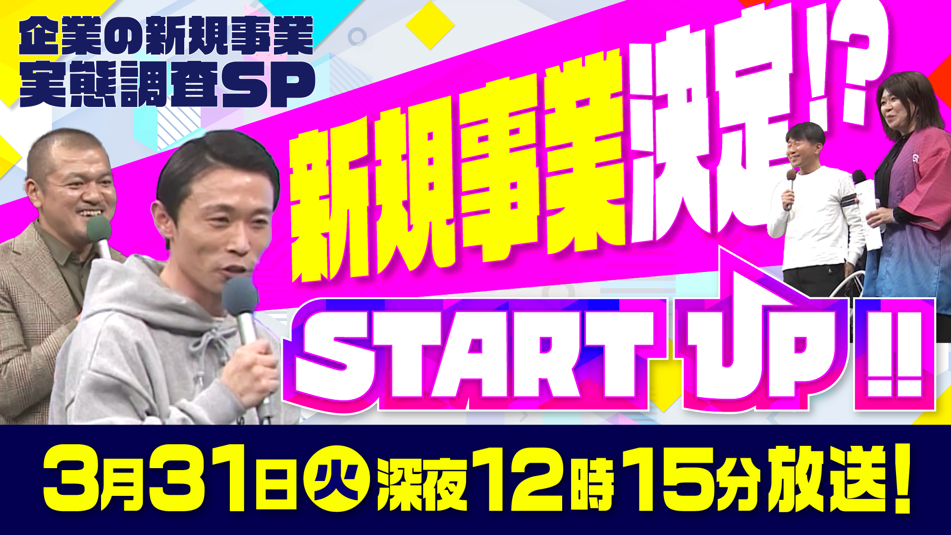 東海テレビ放送株式会社(本社:名古屋市東区)は、2026年3月31日(火)深夜12時15分より、お笑い芸人カミナリが起業家に密着する番組「START UP!!」を放送いたします。