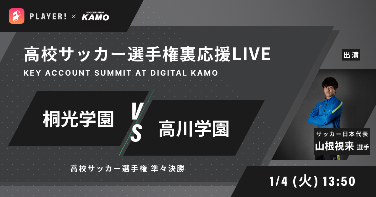 スポーツエンターテイメントアプリ「Player!」はサッカーショップKAMOの協力のもと、高校サッカー選手権特別応援企画を1月4日(火)13:50より配信いたします。第2回目となる今回は、特別ゲストとしてサッカー日本代表「山根視来」選手をお招きし、準々決勝の高川学園vs桐光学園の試合を盛り上げます。