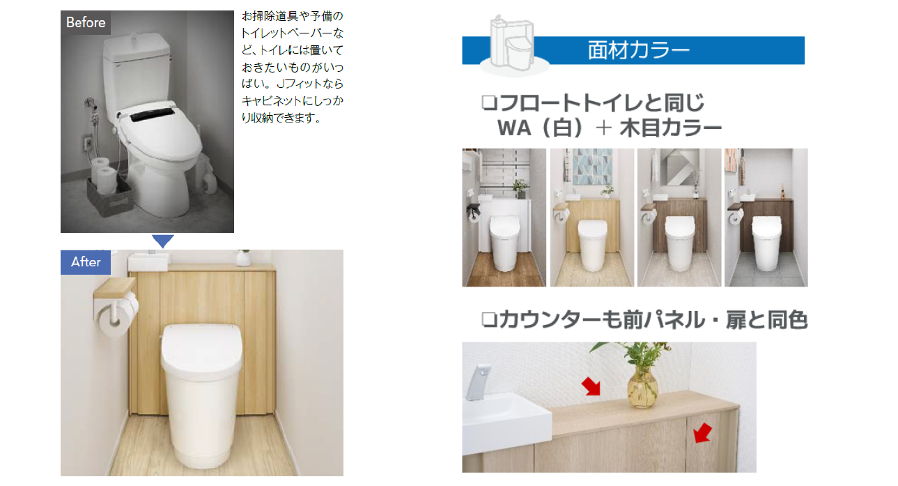 「Jフィット」は、トイレのタンクや給水ホース、お掃除道具をキャビネット内に隠すことで、トイレ空間がすっきりと感じられるキャビネット付トイレです。キャビネットのパネルカラーは周辺アイテムとカラーコーディネートできる4色(ホワイト+木目3色)からお選びいただけるので、ユーザーのお好みやライフスタイルにジャストフィットします。