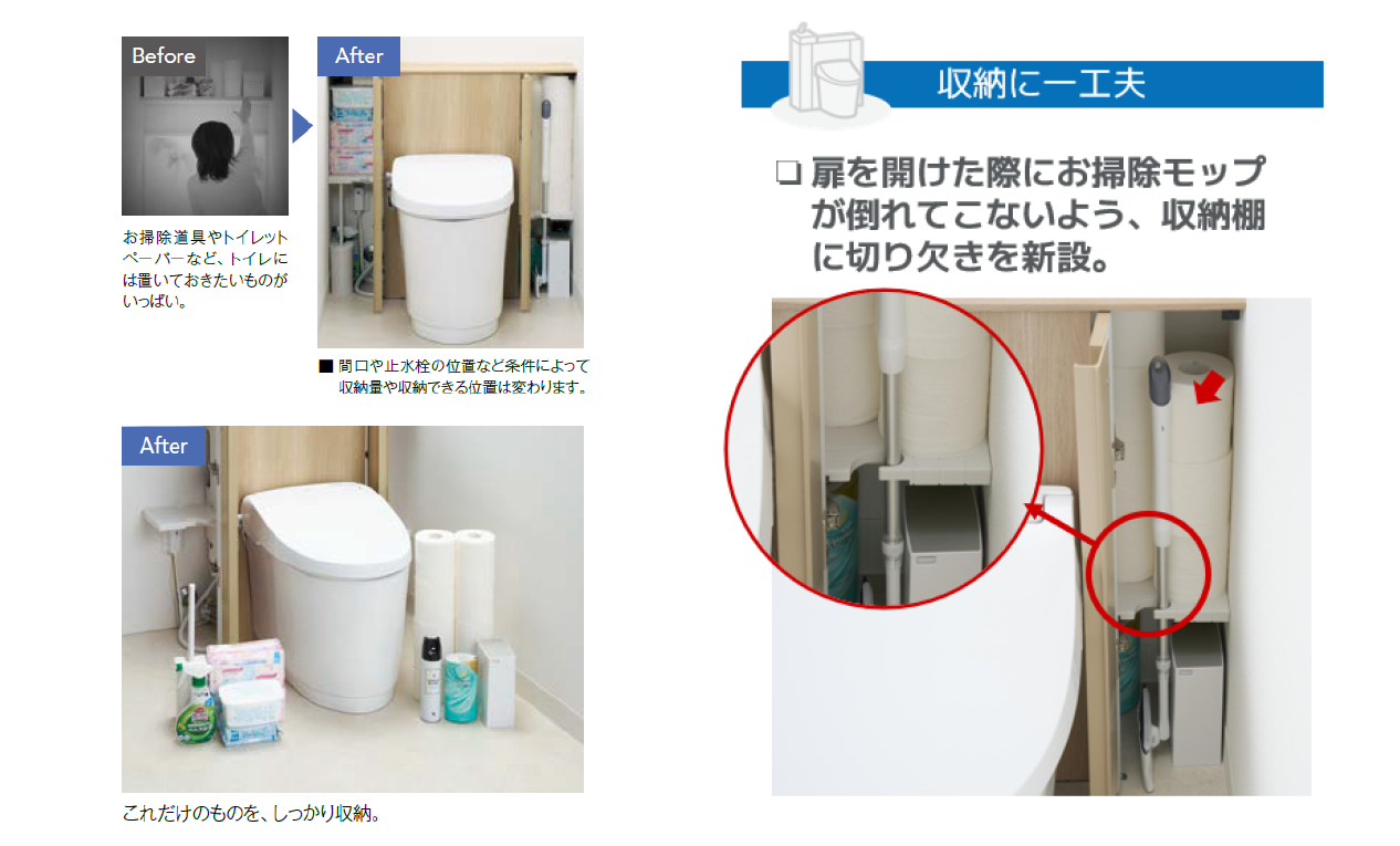トイレに置いておきたいストックやお掃除道具などをキャビネット内にすっきり収納。使いたい時にサッと取り出せます。
