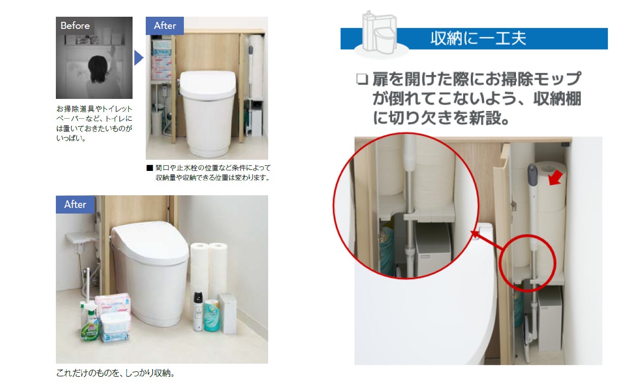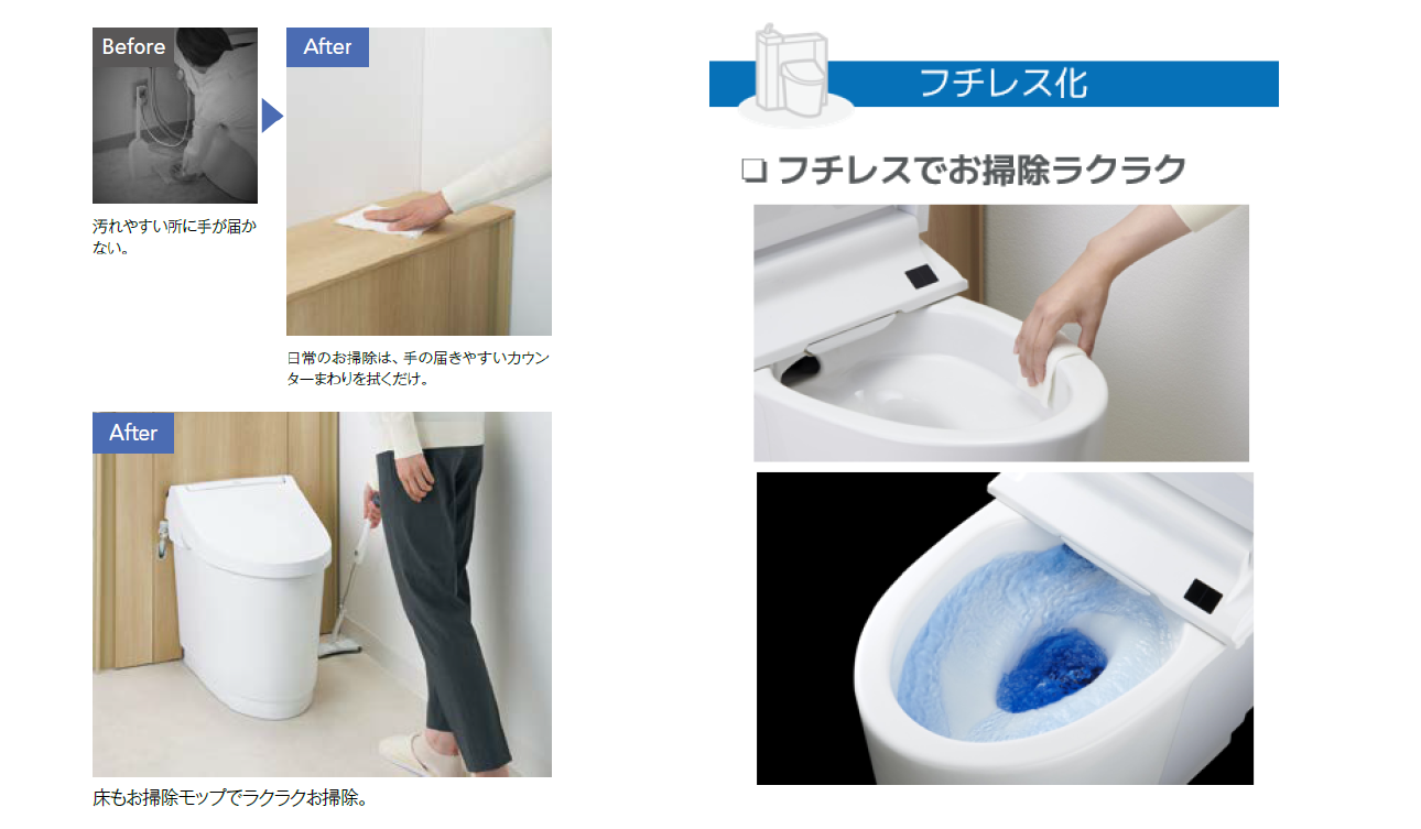手の届きにくい便器奥をキャビネットで隠して、カンタンお掃除。便器のフチを丸ごとなくし、フチレス形状にしました。サッとひと拭き、お掃除ラクラクです。