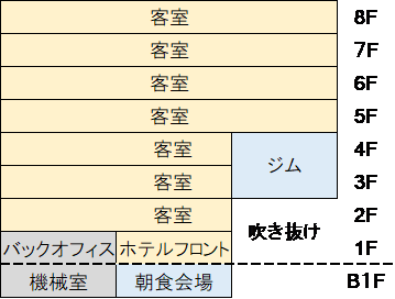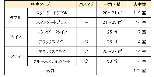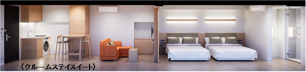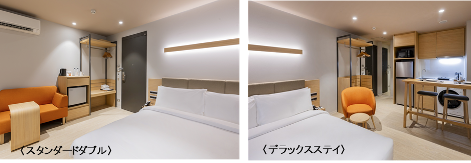 8階建てのホテル内には、ダブルとツインをメインに6タイプ全172室の客室を計画しています。キッチンや洗濯乾燥機等を備えた客室(18室)もご用意しており、中長期の連泊需要にも対応しております。また、ダブルとステイルームはすべてワークスペースを設けたレイアウトになっております。