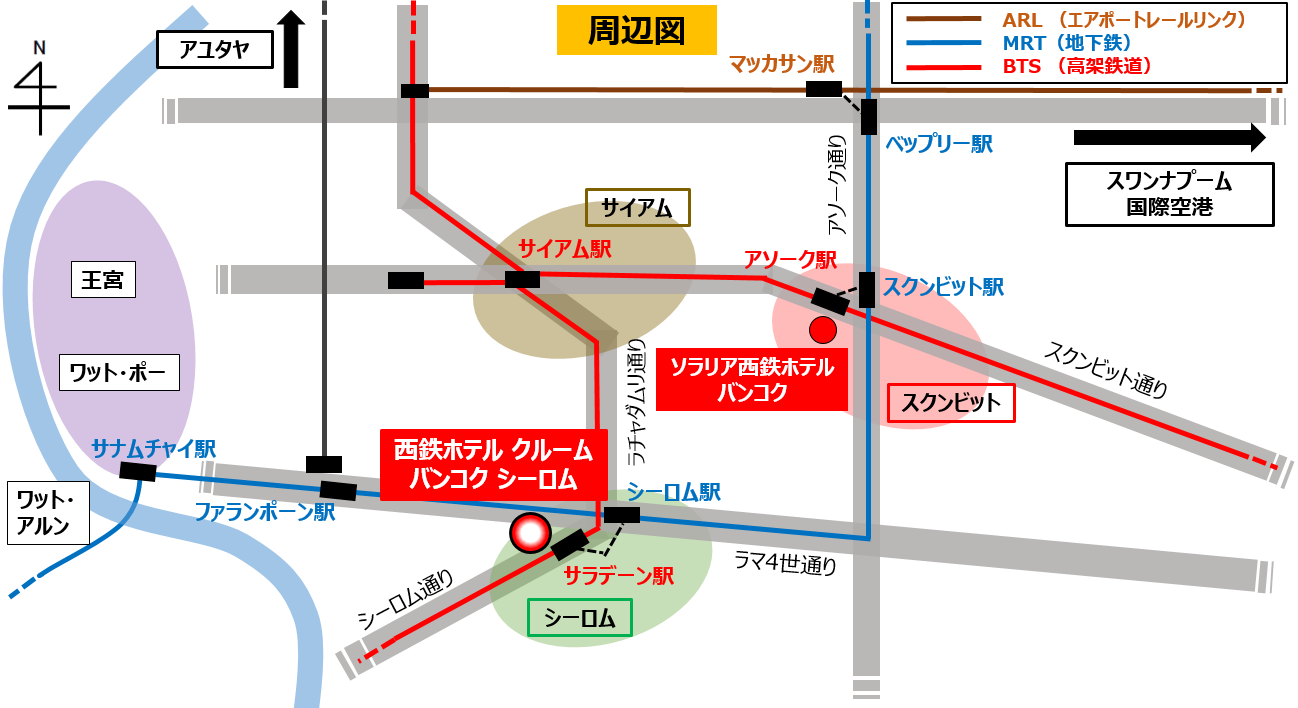 当ホテルは、タイ・バンコクのシーロム地区の中心部に位置し、BTS(高架鉄道)サラデーン駅から徒歩1分、MRT(地下鉄)シーロム駅から徒歩5分と、交通アクセスに優れています。周囲は日系企業が多数進出するタイ国内有数のビジネス街で、出張利用等が見込めるほか、繁華街にも近接していることから観光需要も見込めるエリアです。