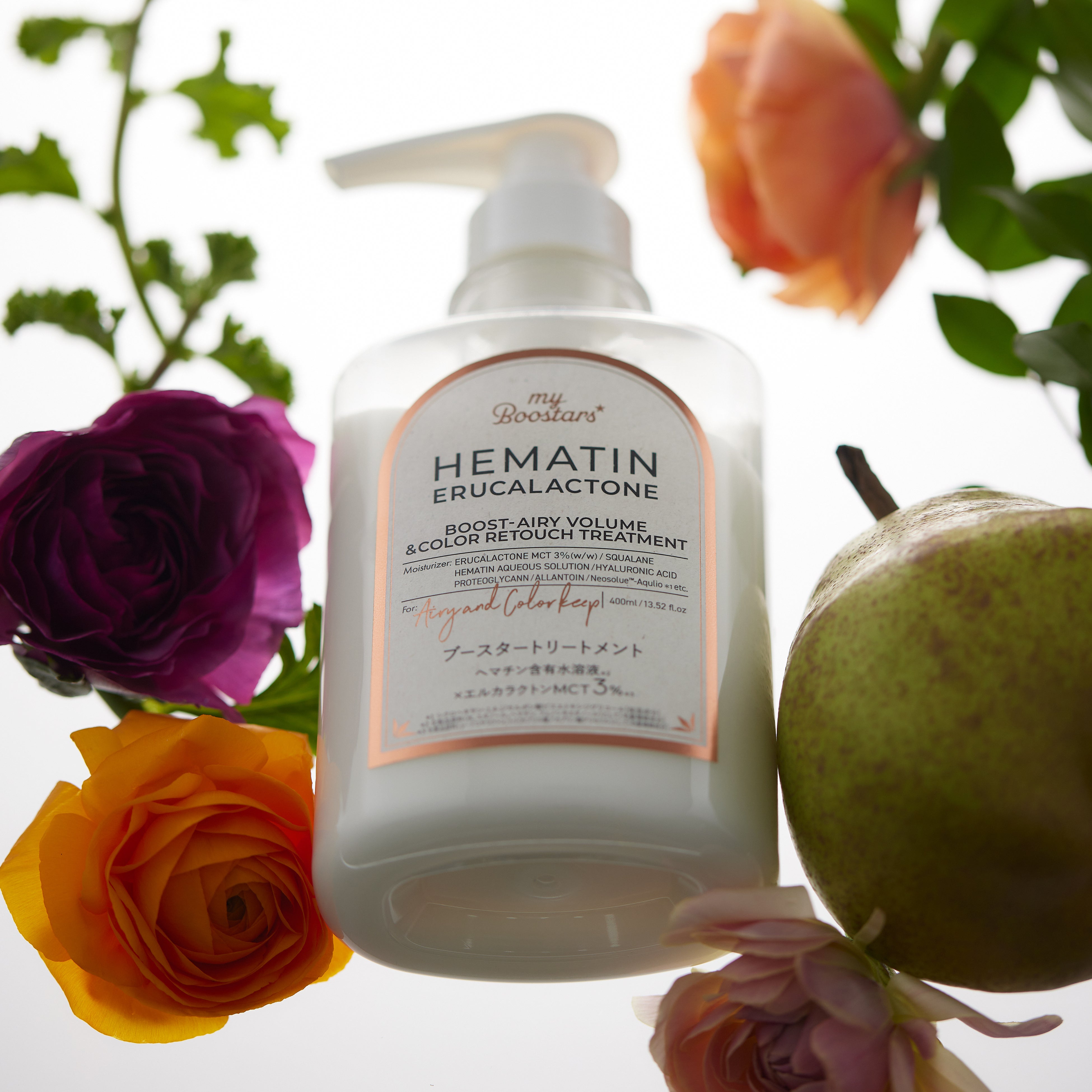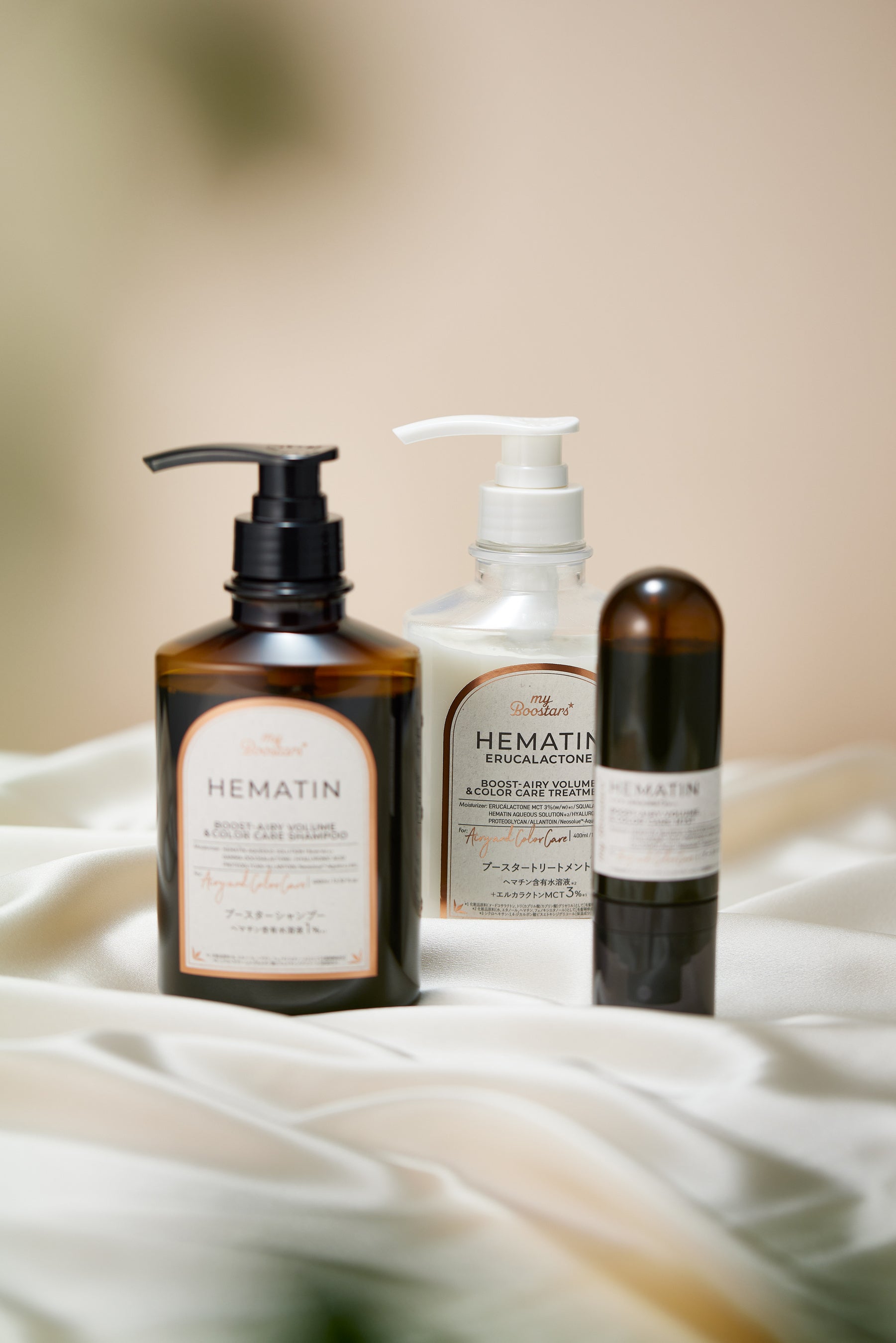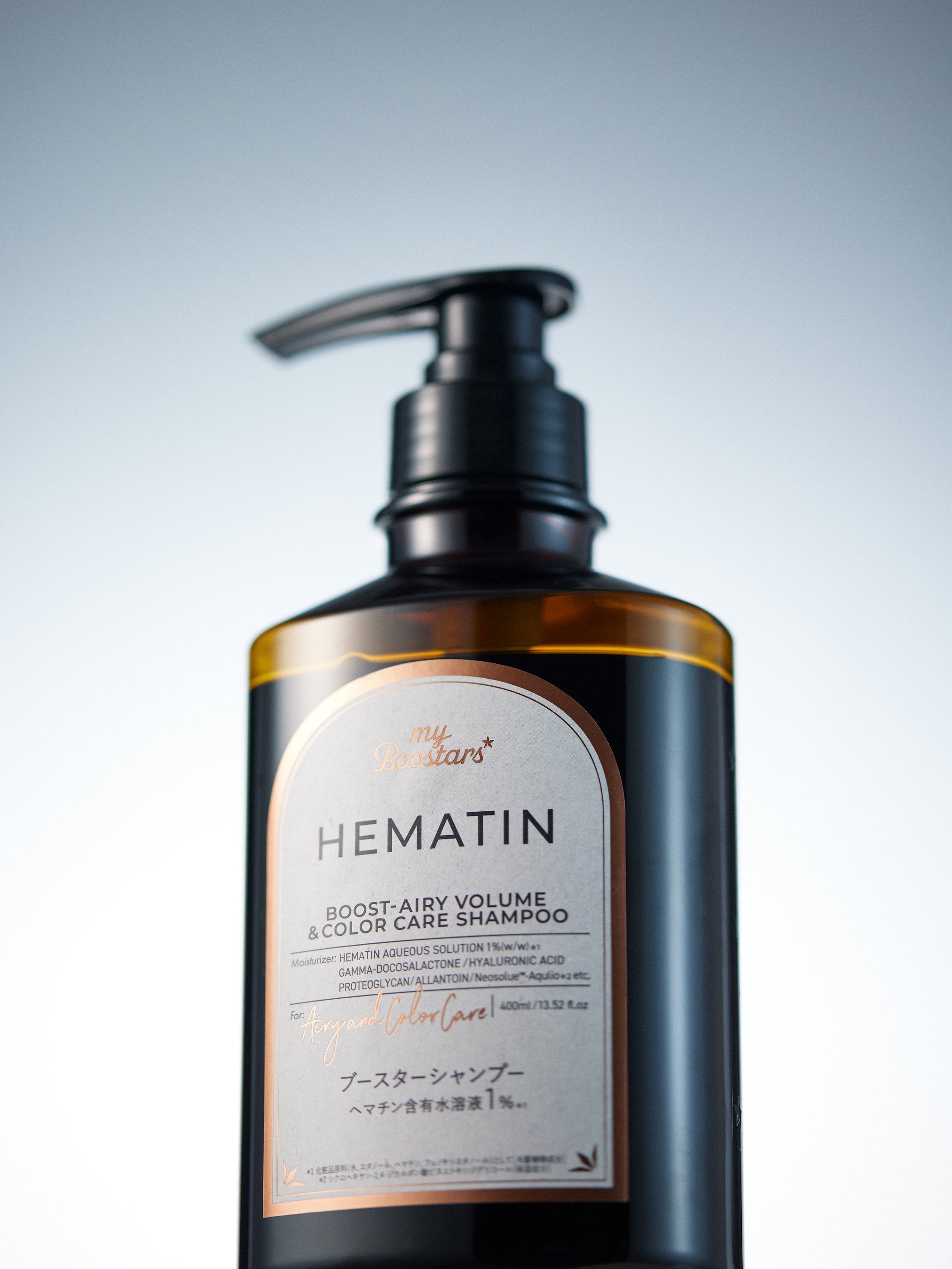 ヘマチンシリーズは、3品すべてにヘマチンを配合。シャンプーには1%、ブースターミストには5%も配合。仕上がりと使用感を追求し、何度も試験を繰り返してたどり着いた、『myBoostars』だからこそ実現できた配合量です。