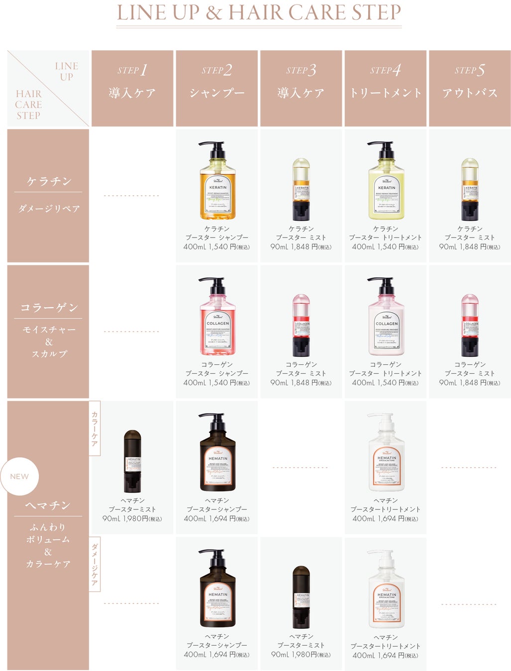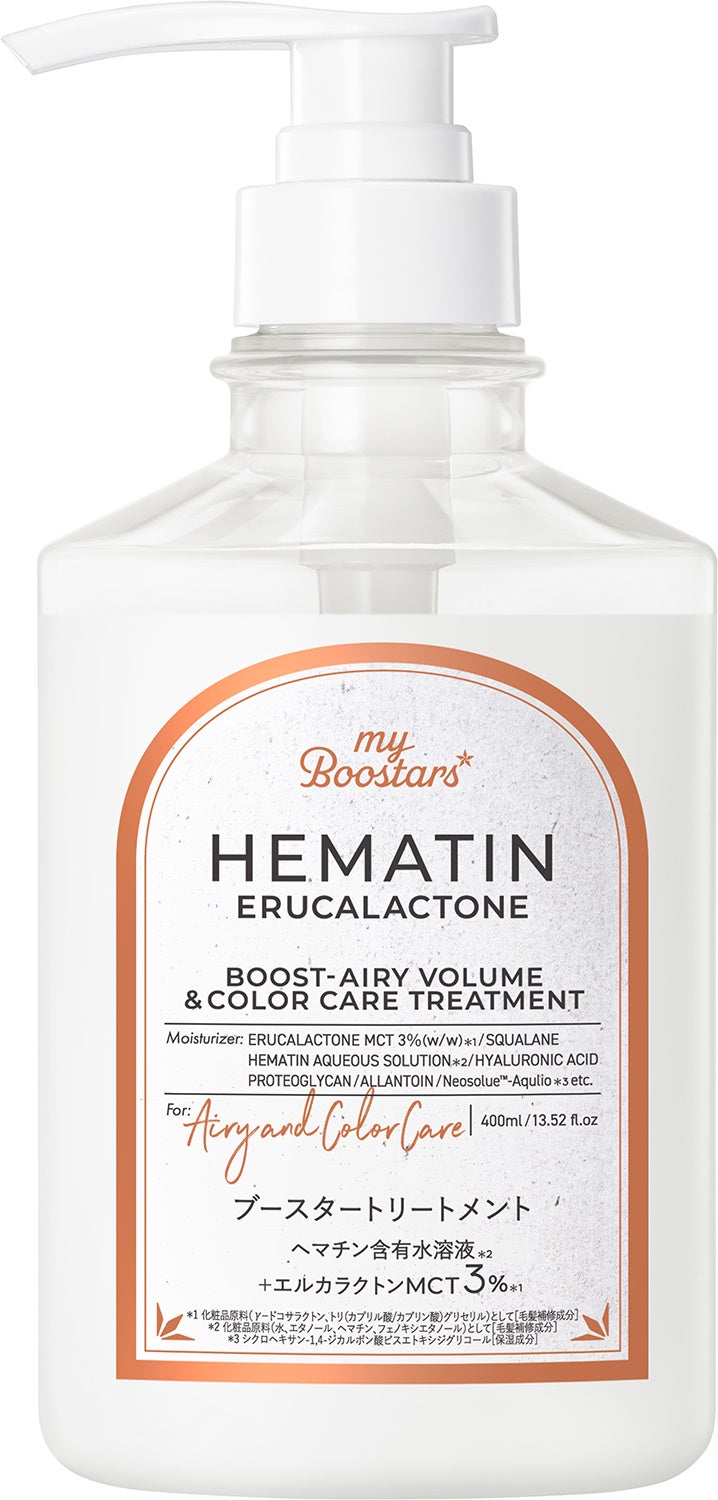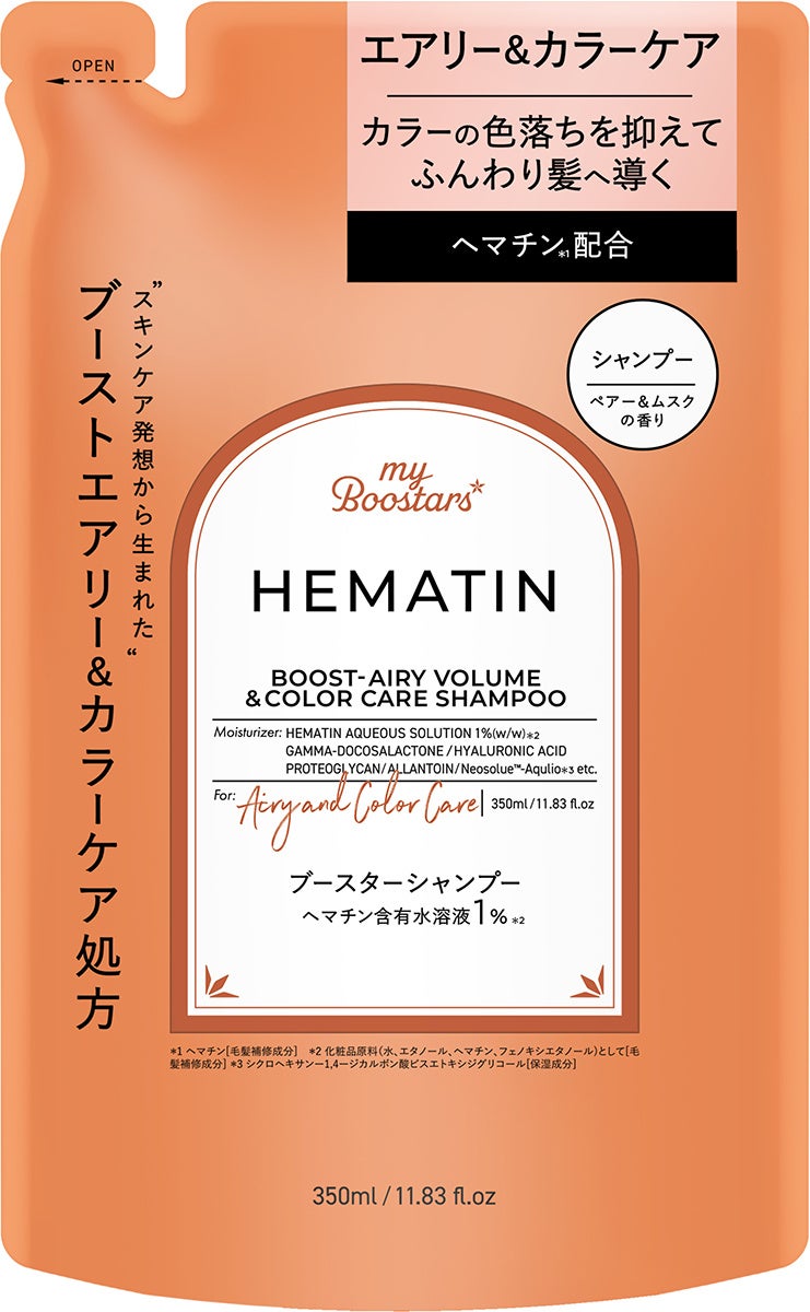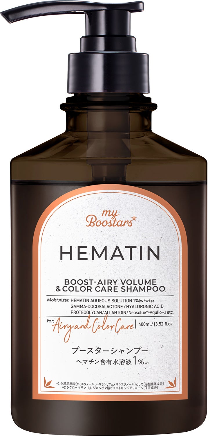 ヘマチンシリーズは、3品すべてにヘマチンを配合。シャンプーには1%、ブースターミストには5%も配合。仕上がりと使用感を追求し、何度も試験を繰り返してたどり着いた、『myBoostars』だからこそ実現できた配合量です。