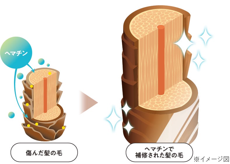 ヘマチンがケラチンと結合して、髪の傷んだ部分を覆いキューティクルを補修すると、