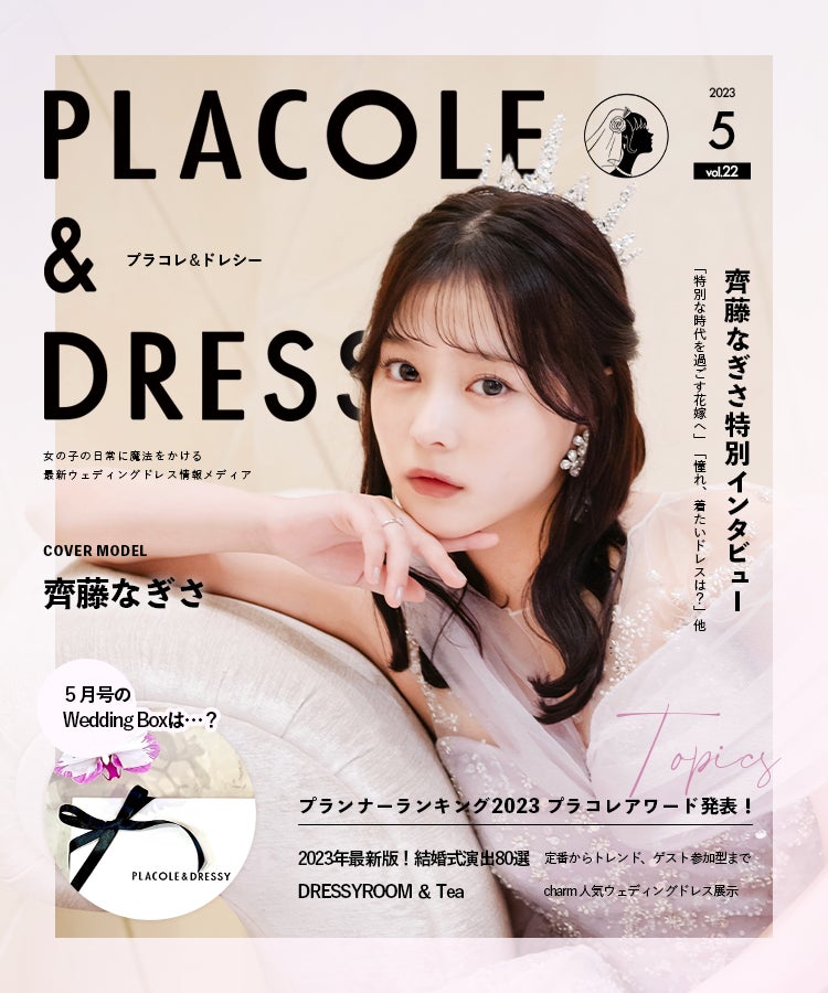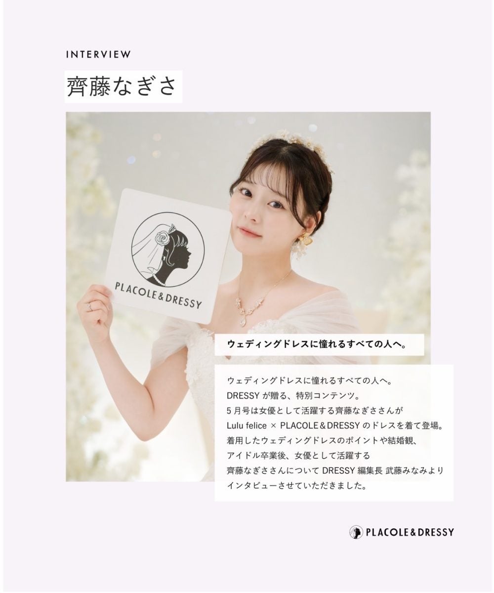 5月号は女優として活躍する齊藤なぎささんがLulu felice × PLACOLE&DRESSYのドレスを着て登場。着用したウェディングドレスのポイントや結婚観、アイドル卒業後、女優として活躍する齊藤なぎささんについてDRESSY編集長 武藤みなみよりインタビューさせていただきました。