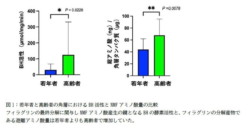 皮膚の最外層を構成する表皮にはバリア機能が備わっており、外来異物の侵入や身体の内側からの水分蒸発を防いでいます。表皮外層に形成される角層バリアを担う因子の1つにNMFがあります。NMFの大部分は遊離アミノ酸(*4)とその誘導体から構成されており、それらはフィラグリンの分解によって生成され、角層の水分量や皮膚表面pHを一定に保つために重要な役割を果たします。これまで、高齢者の皮膚ではフィラグリンの産生低下によるNMF量の減少が生じており、それにより角層水分量が低下し、乾燥肌になると考えられてきましたが、最近では高齢者のNMF量は若年者より多いという報告もありました。そこで、研究グループは健常な若年者と高齢者の角層抽出液を用いて、NMFアミノ酸産生の鍵となるBHの酵素活性及び発現パターンと、NMFアミノ酸産生量に着眼し、皮膚の自然老化におけるNMFアミノ酸の産生動態を解明することを目的に研究を実施しました。