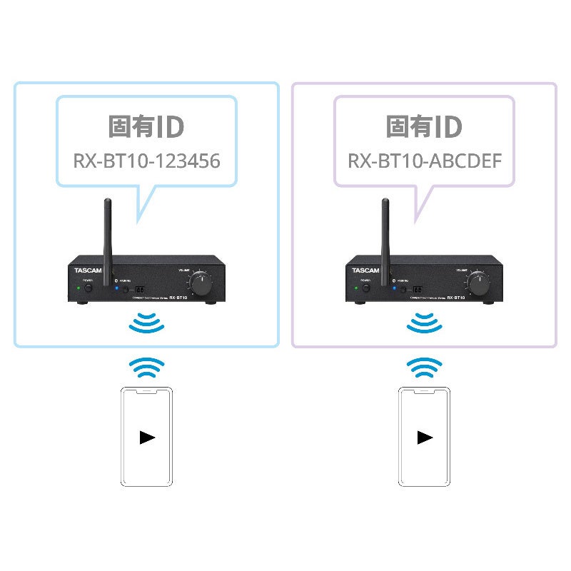 『RX-BT10』はBluetooth®固有識別IDを備えており、iOS、iPadOS、AndroidデバイスでIDの名称変更が可能です。宴会場や会議室などにおいて複数台の『RX-BT10』を使用する際も容易に各機体を識別することができます。