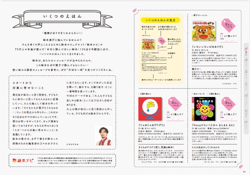 絵本ガイド冊子「いくつのえほん」は、選ばれた全作品の内容紹介や「絵本ナビ」メンバーのママ・パパによるレビューなど、絵本選びの参考になる情報を掲載した小冊子で、店頭企画「いくつのえほん」実施にあわせて全国の展開書店で無料配布しています。実際に読み聞かせをした「絵本ナビ」会員によるレビューは、「何歳の子どもに読んで、どんな反応があったか」など、絵本をプレゼントする際の参考にできます。2025年版では、お笑い芸人や漫画家しても活躍し、『ねこいる!』(ポプラ社)、『なんのサンドイッチ?』(大和書房)などの著書がある絵本作家・たなかひかるさんに、「大人も子どもも楽しめる絵本の魅力」について語っていただいたコラムを掲載しています。