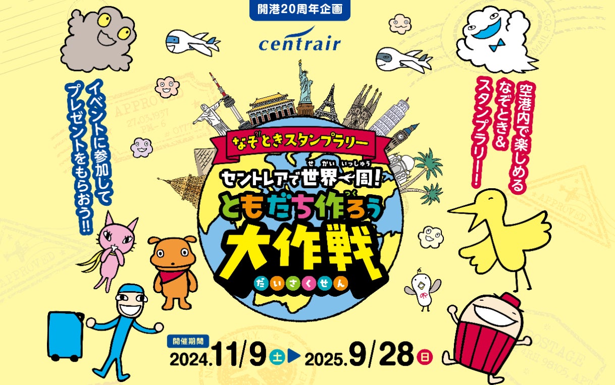 中部国際空港株式会社は(所在:愛知県常滑市、代表取締役社長:犬塚力)、開港20周年を記念して、空港館内を回るラリーイベント「なぞときスタンプラリーセントレアで世界一周!ともだち作ろう大作戦」を開催しております。小学生までのお子様を対象としており、参加者は空港館内を回りながら、なぞとき&スタンプラリーに挑戦いただきます。