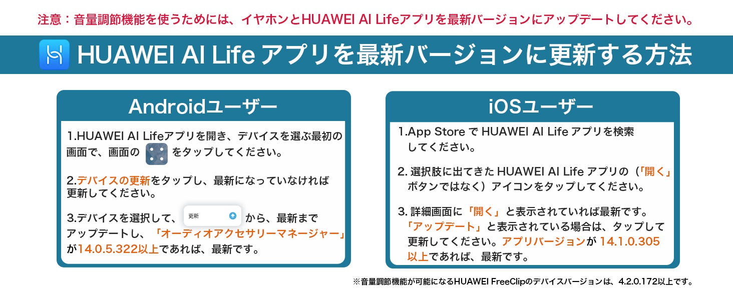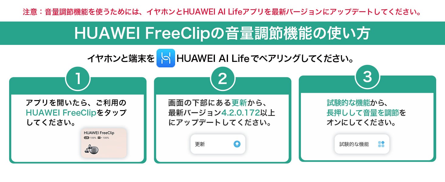 『HUAWEI FreeClip』のイヤホン単体で音量調節機能を使うためには、スマートフォンアプリ「HUAWEI AI Life」を最新バージョンまでアップデートし、その後アプリから『HUAWEI FreeClip』とペアリングしてデバイスのバージョンを最新にアップデートする必要があります。※3
